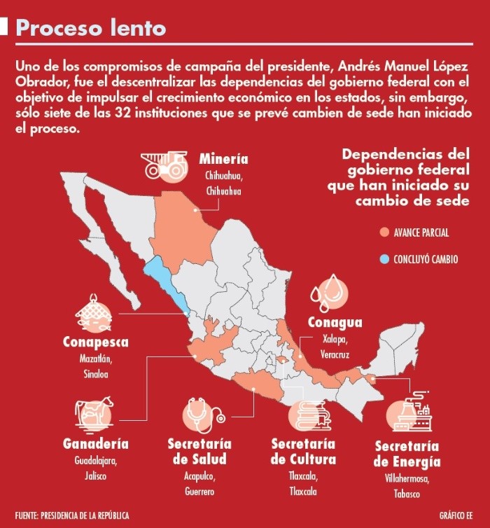 Han pasado casi tres años desde que se anunció la reubicación física de 32 dependencias y entidades federales a los estados, para impulsar las economías locales, y hasta ahora sólo la Comisión Nacional de Pesca y Acuacultura (Conapesca) ha logrado esta meta; otros seis organismos lo han hecho de manera parcial.El titular de la Secretaría de Salud federal (SSA), Jorge Alcocer Varela dijo que desde el pasado 3 de octubre cerca de 100 trabajadores de esa dependencia se trasladaron a su nueva sede, en Acapulco, Guerrero, –entre titulares y personal de la dependencia, de la Subsecretaría de Prevención y Promoción de la Salud, de la Unidad de Análisis Económico, de la Unidad de Administración y Finanzas y el Insabi–, mientras que la reubicación del personal de las demás áreas será de manera voluntaria y progresiva. Añadió que hacia enero del próximo año se sumarán otros 200 trabajadores de SSA y de Cofepris más 120 del Insabi, para, al concluir el primer semestre de 2022, sumar mil 200 trabajadores y trabajadoras trasladados.Otras dependencias con avances en la reubicación son Sener, a Villahermosa; Secretaria de Cultura, a Tlaxcala, así como oficinas de Ganadería, a Guadalajara; Minería, a Chihuahua, y de la Conagua, a Xalapa, según respondió la Presidencia de la República en una solicitud de información fechada en agosto. Conapesca ya se reubicó en Mazatlán, Sinaloa.Según el plan, Turismo se iría Chetumal, Quintana Roo; Medio Ambiente a Mérida, Yucatán; PEMEX a Ciudad del Carmen, Campeche; CFE a Tuxtla Gutiérrez, Chiapas; Bienestar a Oaxaca, Oaxaca; SEP a Puebla, Puebla; Banobras a Cuernavaca, Morelos, y el INFONAVIT a Toluca, Estado de México.Además, el IMSS a Morelia, Michoacán; ISSSTE a Colima, Colima; CONADE a Aguascalientes, Aguascalientes; Función Pública a Querétaro, Querétaro; Secretaría del Trabajo a León, Guanajuato; Desarrollo Agrario a Pachuca, Hidalgo; Comunicaciones y Transportes a San Luis Potosí, SLP; Economía a Monterrey, Nuevo León; Nacional Financiera a Torreón, Coahuila; La Comisión Forestal a Durango, Durango.Y Aduanas a Nuevo Laredo, Tamaulipas; Fonatur a Bahía de Banderas, Nayarit; la Secretaría de Agricultura a Ciudad Obregón, Sonora; el Conacyt a La Paz, Baja California Sur; el SAT a Mexicali, Baja California, la Secretaría de Medio Ambiente a Mérida, Yucatán, y Migración a Tijuana, Baja California. De estas no se han reportado cambios.Sin estudios de factibilidadPara Fernando Nieto Morales, investigador de El Colegio de México, el plan parece más simbólico o discursivo más que una medida anclada en evidencias y en una prospectiva sería de hasta dónde esto puede beneficiar a las comunidades.Advirtió que hasta ahora no hay estudios serios de viabilidad financiera y organización que revelen los beneficios y costos de un esfuerzo de esa magnitud.“Lo que si se sabe es que es una operación muy costosa, los ejemplos que hemos tenido, han sido muy costosos (…) proyectos de muchos años y que costaron mucho dinero”, dijo.Nieto Morales también cuestionó los beneficios ya que, dijo, una política se justifica en términos de costo-beneficio en la medida en la que hay beneficios claros.“El riesgo de que esto salga mucho más costoso de lo que se planeaba también está ahí, ante la ausencia de una planeación seria”.