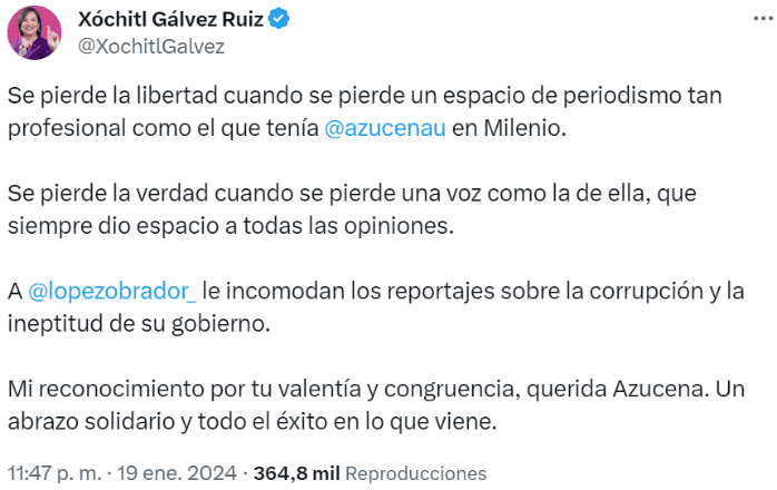 El nombre de la periodista Azucena Uresti se ha vuelto tendencia en redes sociales y ha comenzado a surgir la polémica en torno a ella, así que aquí te contamos por qué. Luego de que Azucena Uresti se despidió este viernes pasado de Milenio, tras 20 años de trabajar en esa empresa, diversos personajes de la política acusaron de "censura" al actual gobierno del Presidente Andrés Manuel López Obrador.La precandidata presidencial de la oposición, Xóchitl Gálvez, señaló directamente en X, antes Twitter, al Presidente López Obrador como el responsable de la salida de la periodista del medio de comunicación y el fin de su programa televisivo "Azucena a las 10"."A @lopezobrador_le incomodan los reportajes sobre la corrupción y la ineptitud de su gobierno".La panista reconoció a Azucena Uresti por su "valentía y congruencia"."Mi reconocimiento por tu valentía y congruencia, querida Azucena. Un abrazo solidario y todo el éxito en lo que viene", finalizó.* * * Mantente al día con las noticias, únete a nuestro canal de WhatsApp * * *OA