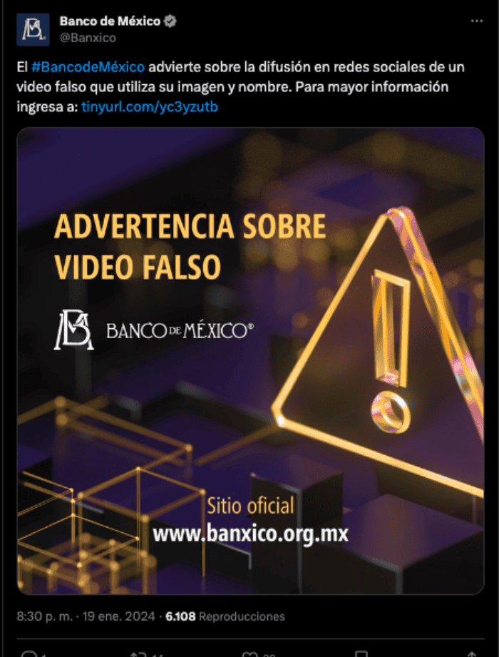 El Banco de México (Banxico) advirtió sobre la difusión de un video falso en redes sociales, el cual hace uso de la imagen y el nombre del instituto central. A través de su cuenta de X, antes Twitter, el banco alertó a los usuarios que dicho video fue generado presuntamente por inteligencia artificial.Además, en el video no solo es utilizado el nombre e imagen, también se falsifica la voz de la gobernadora central, Victoria Rodríguez Ceja, así como la de otras personalidades de la vida pública de México."Este instituto central niega categóricamente la información que se difunde, e insta a la población a ignorar el mencionado video falso para evitar ser víctima de engaños que puedan llevar a operaciones fraudulentas", puntualizó.Enfatizó que Banxico es el banco central del estado mexicano, pero no tiene entre sus facultades realizar operaciones activas, pasivas o de servicios con el público en general.Es decir, no celebra transacciones u operaciones financieras con particulares, por lo cual no solicita a ninguna persona depósitos de dinero o entrega de documentos, ni les requiere realizar trámites en sus oficinas o con sus funcionarios.Tampoco ofrece créditos, inversiones o productos financieros como los que se mencionan en el video, indicó.Informó que la única página oficial del Banco de México es https://www.banxico.org.mx por lo que pidió que en caso de que alguien requiera consultar información publicada por este instituto central, verifique en su navegador web que esa sea la dirección visitada.NA
