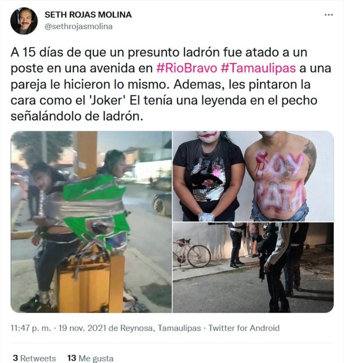 ¿Qué tienen en común Tamaulipas y Ciudad Gótica? Al parecer, un justiciero nocturno que se dedica desde hace varias noches a atrapar ladrones dejándolos amarrados y pintados como el "Joker", principal villano de "Batman", a la vista de las autoridades.De acuerdo con medios locales, en total han sido seis hombres y una mujer los que han sido encontrados en estas circunstancias: maquillados de blanco, con una boca roja en forma de sonrisa y atados a postes con cinta y frases que los señalan de ladrones.En redes sociales ya circulan algunas fotografías de estos presuntos ladrones atados, según reportes preliminares algunos de ellos se dedicaban a asaltar autobuses que iban de Reynosa a Ciudad Victoria en Tamaulipas.Por ahora, la Fiscalía de Tamaulipas no se ha pronunciado al respecto pero se encuentra investigando cada uno de los casos.Por su parte en redes sociales, usuarios han comenzado hablar de estos eventos y hacen referencia a un posible “justiciero” que usa el modus operandi del personaje de ficción, "Batman", para compartir el crimen por las noches.EL INFORMADOR / CAROLINA QUINTANILLAJM