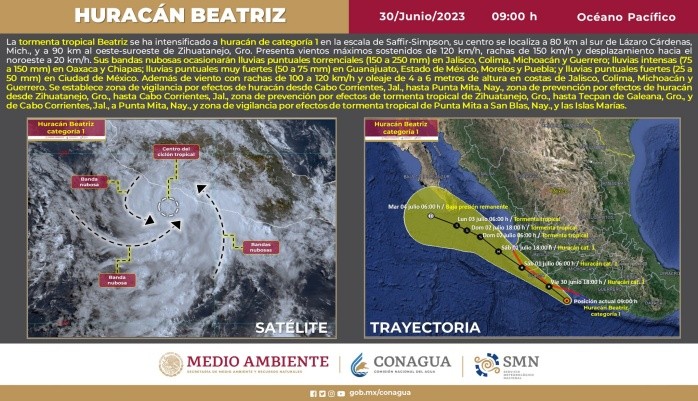 El Servicio Meteorológico Nacional (SMN) informó que "Beatriz" se intensificó esta mañana a huracán categoría 1 en la escala Saffir-Simpson. Al momento, se localiza a 80 km al sur de Lázaro Cárdenas, Michoacán y a 285 km al sureste de Manzanillo, Colima. Sus bandas nubosas ocasionarán lluvias torrenciales, oleaje de 4 a 6 m y viento de 100 a 120 km/h en el occidente de México.Según la Coordinadora Nacional de Protección Civil (CNPC), presenta vientos máximos sostenidos de 120 km/h.El organismo también indica que el Gobierno de México implementa acciones de prevención y preparación ante su evolución."El sistema continúa su desplazamiento paralelo a las costas del Pacífico mexicano; sus bandas nubosas originarán lluvias de fuertes a puntuales torrenciales en el occidente, centro, sur y sureste del territorio nacional", indicó el aviso.Se prevé que sus bandas nubosas ocasionarán lluvias "puntuales torrenciales", de 150 a 250 milímetros, en los estados de Jalisco, Colima, Michoacán y Guerrero, así como lluvias "intensas", de 75 a 150 milímetros, en Oaxaca y Chiapas.Asimismo, se esperan vientos con rachas de 100 a 120 kilómetros por hora y oleaje de 4 a 6 metros de altura en las costas de Jalisco, Colima, Michoacán y Guerrero.Por ello, el SMN pidió "extremar precauciones a la población en general en las zonas de los estados mencionados por lluvias, viento y oleaje, incluyendo la navegación marítima, y atender las recomendaciones emitidas por las autoridades"."Beatriz" llega después de "Adrián", que este viernes se intensificó a huracán categoría 2, pero está a más de 700 kilómetros al sur-suroeste de Cabo San Lucas, Baja California Sur, por lo que no afecta al territorio nacional.El Gobierno de México pronosticó en mayo la formación de hasta 38 ciclones con nombre en la temporada 2023, de los que 5 impactarían al país.De esa cifra, entre 16 y 22 sistemas podrían presentarse por el océano Pacífico y entre 10 y 16 por el Atlántico.El SMN apuntó que en el caso del Pacífico "se esperan de 16 a 22 ciclones tropicales, entre ellos, de 9 a 11 tormentas tropicales, de 4 a 6 huracanes categoría 1 y 2, y de 3 a 5 huracanes categoría 3, 4 y 5".