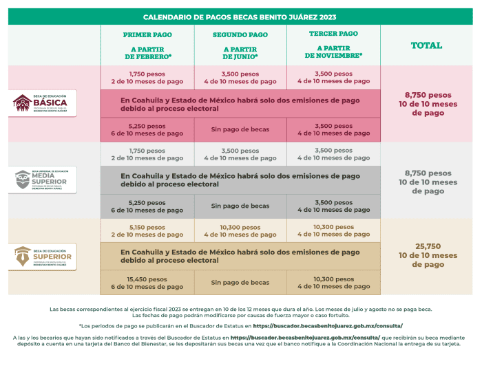 La Beca Benito Juárez, forma parte de los más de 30 programas sociales que brinda el Gobierno de México, esta dirigida a los estudiantes de educación básica, media superior y superior de escuelas públicas del territorio mexicano. Acontinuación los motivos por los que los depósitos del programa serán suspendidos hasta noviembre.La Coordinación Nacional de Becas para el Bienestar Benito Juárez (CNBBBJ) informó que los pagos periódicos de este programa social serán suspendidos hasta el mes de noviembre del 2023, ya que los centros escolares de las 32 entidades de México tendrán periodos vacacionales por verano.La Beca Benito Juárez otorga diez pagos durante un ciclo escolar, en los dos periodos vacacionales no entregan depósitos debido a las vacaciones de diciembre y junio de cada nuevo curso escolar.El próximo y último pago de la Beca Benito Juárez será entregado hasta el mes de noviembre del 2023, y corresponderá a dos periodos y los montos que recibirán son:Periodo 1, enero-febrero y marzo-abril: pago doble de 3 mil 360 pesos, será depositado de la segunda semana de febrero hasta mediados de marzo.Periodo 2, junio-julio: segundo pago de mil 680 pesos que serán depositados entre la tercera y cuarta semana de julio.Periodo 3, septiembre-octubre y noviembre-diciembre: el tercer y último pago corresponderá de 3 mil 360 pesos que será entregado entre la segunda y tercera semana de noviembre.AH