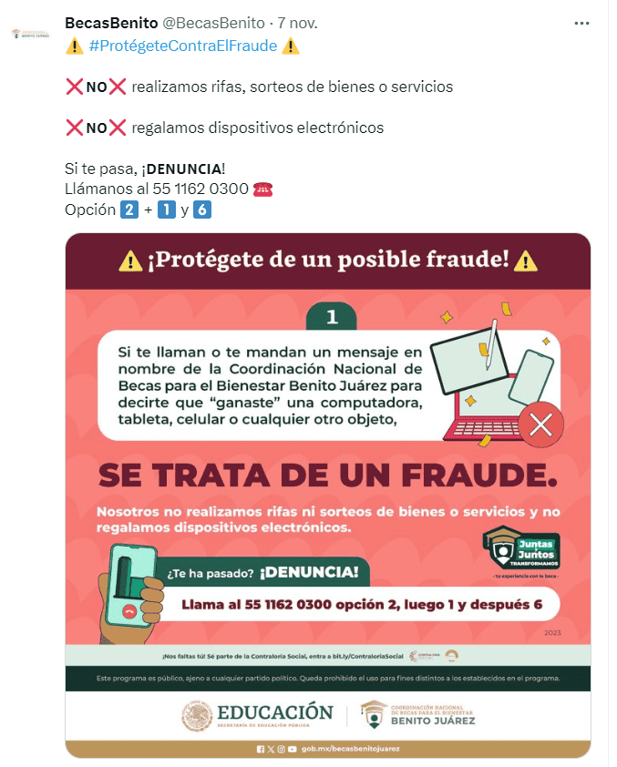 La Becas Benito Juárez se ha convertido en uno de los programas sociales más importantes para la sociedad mexicana, pues otorga un apoyo económico a estudiantes de todos los niveles educativos, desde preescolar hasta educación media superior y superior.Su objetivo es fomentar una educación inclusiva y equitativa enfocada especialmente en la población que cuenta con escasos recursos o en condiciones de vulnerabilidad. De este modo, busca contribuir en la defensa del Derecho a la Educación y Desarrollo Humano, así como disminuir la deserción escolar.Para garantizar este derecho con igualdad a todos los estudiantes del país, el programa de Becas Benito Juárez cuenta con tres modalidades:Con ellas han sido beneficiados 10 millones 522 mil 966 estudiantes de 62 mil 419 escuelas prioritarias.No obstante, al ser un programa nacionalmente reconocido, han decidido emitir un aviso importante, no solo a sus beneficiarios, sino a la población en general, respecto a la entrega de celulares y computadoras.A través de su cuenta oficial de X, las autoridades de la Coordinación Nacional de Becas para el Bienestar Benito Juárez han alertado a la población y en especial a sus beneficiarios sobre posibles llamadas o mensajes que pueden recibir a nombre de esta institución en la que les anuncian que han ganado una computadora, tableta, celular o cualquier otro objeto o dispositivo.En dicha alerta informaron que esto se trata de un fraude, ya que ellos no hacen rifas ni sorteos de bienes o servicios y no regalan tampoco dispositivos electrónicos, por lo que invitó a la sociedad a denunciar este hecho en caso de que sean contactados.Los pasos a seguir para realizar la denuncia son los siguientes: 1. Llmar al número 55 1162 03002. Seleccionar la tecla 23. Seleccionar la tecla 14. Seleccionar la opción 6Sigue al día con las noticias, únete a nuestro canal de WhatsAppYC