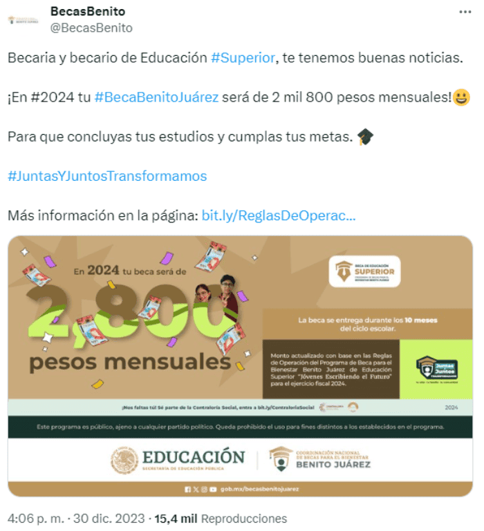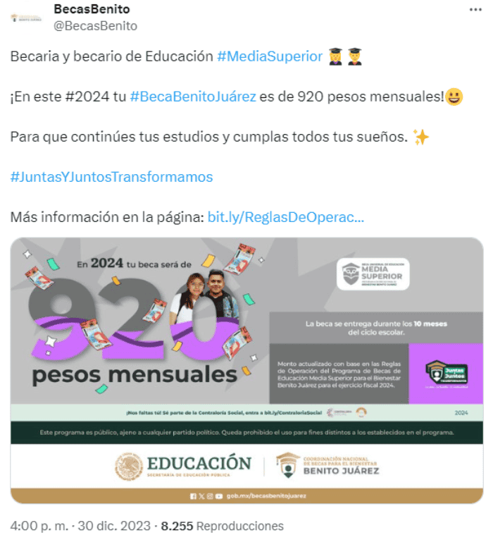 Este año 2024 algunos programas sociales tendrán un aumento, entre éstos se encuentra la beca Benito Juárez que le brindará a los estudiantes un incremento en la suma que se recibe a lo largo de 10 meses.Fue en el Diario Oficial de la Federación (DOF) en donde se hizo oficial, con entrada en vigor desde el 1 de enero del 2024, que los estudiantes que cumplan con los requisitos señalados por el programa podrán recibir el monto de 920 pesos mensuales.La entrega de esta beca se realiza por medio de las tarjetas del Banco del Bienestar hasta por 10 meses, que corresponden con el ciclo escolar.Lo anterior aplica para los alumnos inscritos en Instituciones Públicas de Educación Media Superior del Sistema Educativo Nacional (IPEMS) o en Instituciones de Educación Media Superior del Sistema Educativo Nacional (IEMS) que pertenecen al Sistema Educativo Nacional (SEN). Por otro lado, la Beca Benito Juárez para Educación Superior alcanza ahora la entrega de 2,800 pesos mensuales hasta por 10 meses para este año 2024.SV