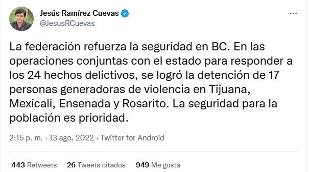 Autoridades detuvieron a 17 personas tras una jornada violenta la tarde del viernes en distintas ciudades del estado de Baja California, que incluyó bloqueos de vías y vehículos incendiados."Fuerzas federales, estatales y municipales lograron la detención de 17 personas generadoras de violencia y sujetos que intervinieron en los eventos", dijo este sábado la Secretaría de Seguridad Pública en un comunicado.La dependencia dijo que en las ciudades de Tijuana, Tecate, Mexicali y Rosarito se registró la quema de vehículos de transporte público y particular por parte de civiles armados, que dejaron una persona lesionada.Agregó que tres de las personas detenidas fueron identificadas como integrantes del Cártel Nueva Generación.Por su parte, el consulado de Estados Unidos en Tijuana instruyó a los empleados del gobierno estadounidense en la zona que se mantengan resguardados hasta nuevo aviso."El Consulado General de Estados Unidos en Tijuana está al tanto de reportes de múltiples incendios a vehículos, bloqueos a calles, y fuerte actividad policiaca en Tijuana, Mexicali, Rosarito, Ensenada, Tecate", dijo en un comunicado.La jornada violenta en Baja California -que no dejó fallecidos- ocurrió un día después de que Ciudad Juárez se viera sacudida por diversos ataques armados con saldo de 11 muertos, incluidos un locutor de radio y un menor de edad, así como comercios incendiados.JM