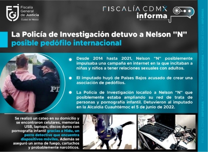 Después del arresto del holandés Nelson "N", la fiscal Ernestina Godoy Ramos detalló que una vez que tuvieron conocimiento de que dicha persona se encontraba en la Ciudad de México, se llevaron a cabo diversos seguimientos de cámaras del C5 para conocer el domicilio donde se localizaba.Del mismo modo vigilaron sus rutinas y el contacto que buscaba tener con otros posibles pedófilos, por lo que se realizó una operación encubierta que permitió su detención en inmediaciones del Centro de Transferencia Modal de Chapultepec. Desde abril de 2014 y hasta marzo de 2021, Nelson 'N' posiblemente promovió publicaciones en páginas y redes sociales que incitaban a legalizar el sexo con personas menores de edad, quienes, él señalaba, tenían la capacidad de decidir si era su deseo sostener relaciones con una persona adulta", indicó la funcionaria. Supuestamente habría generado un blog en internet, actualmente dado de baja, en el que difundía historias sobre pedofilia y en donde habría afirmado su preferencia por los niños. Luego de que se realizó su detención, ministerios públicos, peritos y detectives de la Policía de Investigación, con el apoyo de un binomio canino especializado en el rastreo de dispositivos electrónicos, ejecutaron una orden de cateo en un domicilio ubicado en la alcaldía Gustavo A. Madero.En ese lugar encontraron fotografías con pornografía infantil, computadoras portátiles, un teléfono celular, discos duros, diversas tarjetas electrónicas de memoria, así como dos pasaportes de los Países Bajos, indicios que fueron asegurados, para ser integrados a la carpeta de investigación y posteriormente ser analizados con la autorización judicial.Tras su aseguramiento, las autoridades trabajan en la integración de la carpeta de investigación para presentarlo ante un juez de control. Asimismo, el Ministerio Público solicitó ya la asistencia consular debido a que es extranjero.FS