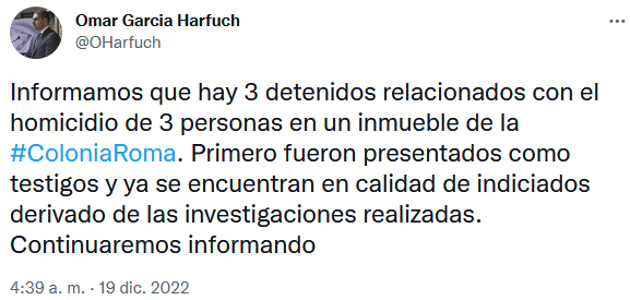 Omar García Harfuch, titular de la Secretaría de Seguridad Ciudadana, confirmó la detención de tres personas relacionadas con el asesinato de tres personas, entre estos los hermanos Jorge y Andrés Tirado, en un departamento de la colonia Roma Norte.A través de un tuit, el secretario de Seguridad de la capital señaló que primero fueron presentados en calidad de testigos y conforme avanzaron las investigaciones "ya se encuentran en calidad de indiciados"."Informamos que hay 3 detenidos relacionados con el homicidio de 3 personas en un inmueble de la #ColoniaRoma. Primero fueron presentados como testigos y ya se encuentran en calidad de indiciados derivado de las investigaciones realizadas. Continuaremos informando", escribió en su cuenta de Twitter sin dar más detalles.La tarde del domingo, la Fiscalía General de Justicia de la Ciudad de México (FGJCDMX) confirmó el hallazgo de tres hombres sin vida, entre ellos un adulto mayor, en el interior de un domicilio, ubicado en la colonia Roma Norte, alcaldía Cuauhtémoc.Más tarde se dio a conocer que entre las víctimas estaban los hermanos Jorge y Andrés Tirado, reportados como desaparecidos desde el viernes pasado por la comunidad artística, pues ambos eran conocidos en ese medio.Ambos fueron vistos por última vez en la colonia Roma Norte, Ciudad de México (CDMX), el pasado viernes 16 de diciembre de 2022.A través de redes sociales, amigos y familiares de Jorge Tirado y Andrés Tirado han compartido fotos de los dos jóvenes y piden que se comunique cualquier información sobre su paradero a un correo electrónico."Estamos buscando a los hermanos Jorge y Andrés Tirado que no aparecen desde ayer por la tarde en CDMX. Por favor si alguien tuviera información favor de comunicar a busquedatirado@gmail.com".Ambos hermanos iban a bordo de un auto Ónix 2021, color gris oxford, con placas JFS4558 de Jalisco.OA