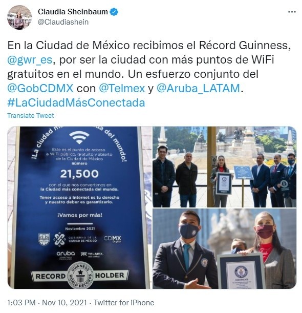 La Ciudad de México fue reconocida este miércoles por la organización Guinness como la urbe "más conectada del mundo" por tener el mayor número de puntos de wifi público gratuito.Carlos Tapia, adjudicador oficial de Guinness World Records para México y América Latina, entregó el galardón a la jefa de Gobierno Claudia Sheinbaum en una ceremonia realizada a los pies del turístico Ángel de la Independencia, símbolo de la megaurbe.Guinness "certifica al gobierno de la Ciudad de México por el mayor número de 'hotspots' en una misma red de wifi gratuita, con una cifra total de 21 mil 500", anunció Tapia.Tras recibir el reconocimiento, Sheinbaum sostuvo que esta amplia red de puntos de conexión gratuita busca "crear el derecho del Internet para todos", en especial para aquellas familias de escasos recursos que no tienen el servicio en casa.Los puntos de conexión están distribuidos en buena parte de la ciudad de 9.2 millones de habitantes, especialmente en el transporte público, aunque en ocasiones la conexión es difícil porque la red se satura.La Ciudad de México, una de las urbes más pobladas del mundo que junto con municipios de estados vecinos alberga a más de 20 millones de personas, es poseedora de varios récords Guinness, algunos ligados a algún platillo gigantesco o por reunir a la mayor cantidad de gente bailando. AF