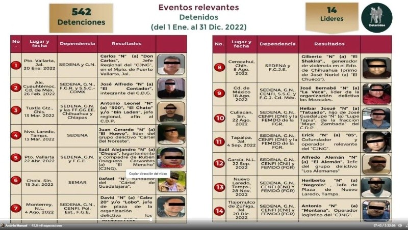 Durante 2022, han sido detenidos al menos 14 líderes pesados de la delincuencia organizada de diferentes cárteles, según dio a conocer el Gobierno federal.La mayoría de los narcotraficantes fueron capturados por elementos federales de la Secretaría de la Defensa Nacional, Marina, Guardia Nacional y Fiscalía General de la República, pero en algunos de los casos también participaron corporaciones estatales.Apenas el pasado jueves 5 de enero en este año fue aprehendido Ovidio Guzmán López, hijo de Joaquín "El Chapo" Guzmán, uno de los líderes del Cártel de Sinaloa. Él es el capo detenido de forma más reciente.El 2022 capturaron al menos 14 cabecillas de diferentes grupos delictivos, según el Gobierno federal.Carlos “N” alías “Don Carlos” operador logístico del Cártel Nueva Generación (CNG) fue detenido el 20 de enero en un departamento de lujo en La Marina, Puerto Vallarta, operativo de las fuerzas federales que resultó sin disparos, ya que incursionaron silenciosamente los soldados por un campo de golf. En el cateo en flagrancia se aseguró: un kilógramo de metanfetamina, dos mil 500 pastillas de fentanilo y un arma larga con lanzagranadas.El 26 de febrero Autoridades mexicanas detuvieron a José Alfredo “N”, conocido como "El Contador", líder del cártel del Golfo en la Ciudad de México, informó el gabinete de seguridad del Gobierno de México.“El gabinete de seguridad del Gobierno de México informa que el Ejército Mexicano, la Guardia Nacional y la Secretaría de Seguridad Ciudadana de la Ciudad de México, con información de inteligencia del Centro Nacional de Inteligencia (CNI) lograron la detención en la capital del país de José Alfredo “N” alias el Contador”, precisó la dependencia en un comunicado.En marzo fue aprehendido en Chihuahua Antonio Leonel “N”, alias "El Chato" o "Bin Laden", es un narco líder de sicarios del grupo criminal Gente Nueva, una célula del Cártel de Sinaloa que opera en la zona norte del país, principalmente en el estado de Chihuahua.Al “Bin Laden”, del Cártel de Sinaloa, también se le atribuye el asesinato y secuestro del comandante Luis Raúl Tarango Ávula, ocurrido en 2021.También este sujeto era acusado, entre otros delitos, de secuestro, por el que se le giró una orden de aprehensión hasta lograr su captura por parte de miembros de la Fiscalía General del Estado de Chihuahua, la Secretaría de la Defensa y la Guardia Nacional.También en marzo fue detenido por las autoridades mexicanas luego de que fue deportado de Estados Unidos, el líder del cártel del Noreste, Juan Gerardo “N”, alias "El Huevo".En un comunicado la Secretaría de la Defensa Nacional destacó su aprehensión: “ La captura de Juan Gerardo 'N' (a) 'El Huevo', líder del Cártel del Noreste, constituye un golpe certero a las organizaciones delincuenciales del país”, dice el texto.El Gobierno Federal confirmó en abril que detuvieron a Saúl Alejandro “N”, alias “El Chopa”, líder del Cártel Nueva Generación y quien estaría relacionado con el asesinato del exgobernador de Jalisco Aristóteles Sandoval Díaz.“El 22 de abril de 2022 realizaron la detención de Saúl Alejandro “N” (a) “El Chopa”, lugarteniente de un cártel generador de violencia con influencia nacional e internacional con bastión en el estado de Jalisco y otra persona más que lo acompañaba”, señala el documento firmado por la Secretaría de la Defensa Nacional y la Guardia Nacional.En el documento, el Gobierno Federal añadió que “El Chopa” sufrió heridas de proyectil de arma de fuego y fue trasladado a un hospital de ese municipio, donde murió.El 15 de julio de 2022, el Gobierno de México logró la segunda captura de Rafael Caro Quintero. Tras casi 10 años de su liberación, fue recapturado en la Sierra de Sinaloa, luego de ser sorprendido por Max, un perro adiestrado por la Secretaría de la Marina (Semar).El día de la detención, Caro Quintero, enemigo número 1 de Estados Unidos por su probable participación o autor intelectual de la muerte del agente de la DEA Enrique “Kiki” Camarena, estaba escondido en una finca en el poblado de San Simón, en el municipio de Choix.Escuchó un helicóptero y salió a ocultarse entre matorrales. Todo fue inútil, pues integrantes de la Marina lo detuvieron con ayuda del binomio caninoEn agosto fue detenido en Monterrey, Nuevo León el jefe de plaza de la organización delictiva de Los Arellano Félix, quien fue identificado como David “N”, alias "Cabo 20" o "Lobo".El Cabo 20 fue el terror de las calles de Tijuana, Tecate, Ensenada y San Quintín, además de ser acusado de ser el principal generador de violencia en la zona costa de Baja California; entre uno de los homicidios más sonados que se le adjudican es del fotoperiodista Margarito Martínez.Gilberto “N” alías “El Shakira”, fue detenido y ubicado el 8 de agosto por la Sedena en un campamento en una brecha de Tubares (Urique) a Choix, Sinaloa, y se le relaciona con José Noriel Portillo Gil, alias "El Chueco", criminal que estaría detrás del asesinato de dos sacerdotes jesuitas y un guía de turistas en la Sierra Tarahumara en Chihuahua.El 18 de agosto fue capturado en la Ciudad de México por elementos del Ejército, Guardia Nacional, el Centro Nacional de Inteligencia, José Bernabe “N” alias "La Vaca", líder de la organización delictiva Los Mezcales o cártel independiente de Colima.Su captura fue muy comentada por la reacción de sus secuaces. El grupo de La Vaca incendió carros en avenidas principales y carreteras de Colima.Heibar Josué “N”, hijo y sucesor de José Guadalupe “N”, alias "Lupe Tapia", quien presuntamente es el principal traficante de droga sintética de Ismael “Mayo” Zambada, del Cártel del Pacífico, fue detenido en Sinaloa el 22 de agosto, informó en aquella ocasión la Secretaría de la Defensa Nacional.En Jalisco, el pasado 4 de septiembre fue captu