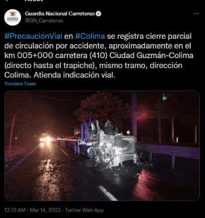 Sin embargo, la Guardia Nacional Carreteras informó en redes sociales que hay un cierre a la circulación por un "accidente, aproximadamente en el km 143+500 autopista (50) Acatlán de Juárez-Colima, mismo tramo, dirección Ciudad Guzmán. Atienda indicación vial".