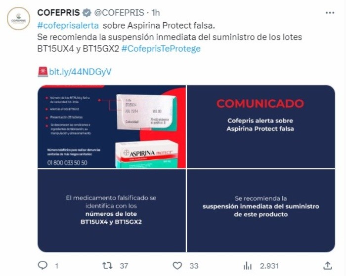 Meses atrás en México circularon series de lotes de Coca-Cola falsa, lo cual llevó a las autoridades a hacer el rastreo debido de dichos productos. Con la búsqueda han salido a la luz otros artículos que han sido clonados, tales como los condones, la Coca-Cola, y cerveza. Sobre esto la Comisión Federal para la Protección contra Riesgos Sanitarios (COFEPRIS) ha lanzado distintas alertas para que los consumidores tengan especial cuidado en lo que compran y llevan a su cuerpo.El día de hoy, la COFEPRIS alertó a todos los mexicanos sobre la Aspirina Protect falsa. Este medicamento suele usarse para aliviar los dolores de cabeza y migraña, por lo que no extraña que más de uno cargue con su propia en su bolsa y es por esto que es fundamental que revises si la caja que tienes guardada en tu casa o la pastilla que compraste en la tiendita de la esquina no pertenece a este lote.Según la advertencia de las autoridades de salubridad, se trata de la Aspirina Protect 100 mg de la compañía Bayer de México. De hecho, esta misma informó a la comisión sobre su producto falsificado, en presentación de 28 tabletas con número de lote BT15UX4. Además, agregaron, el medicamento falso tiene fecha de caducidad de julio de 2024, cuando el producto original, con el mismo número de lote, presenta fecha de caducidad de septiembre de 2023.Asimismo, la COFEPRIS señaló que han recibido notificaciones de autoridades internacionales para indicarles la detección de otro producto falso de la misma marca, pero con lote BT15GX2.Las recomendaciones directas es revisar el número de lote marcado en la caja. En el caso de tener Aspirina Protect 100 mg falsa con los números de lotes antes mencionados, hay que suspender inmediatamente su uso.En caso de que ya se haya usado el producto y se han presentado reacciones adversas o malestares, se puede reportar en la página de salud de COFEPRIS (aquí) o enviar un correo al farmacovigilancia@cofepris.gob.mx