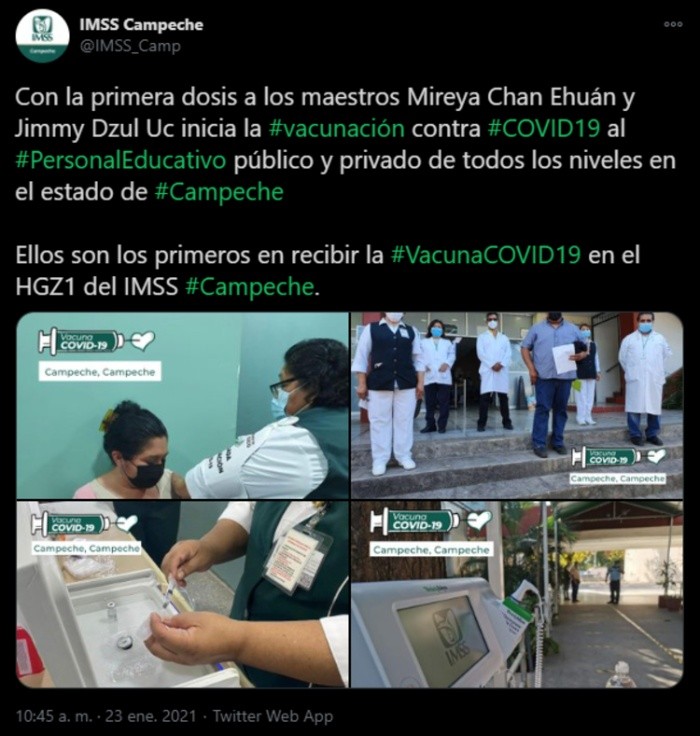 El Gobierno de México comenzó este sábado a vacunar contra el COVID-19 a los 20 mil maestros del estado de Campeche, la región del país con menor índice de contagios, para que en las próximas semanas se puedan retomar las clases presenciales en la zona, suspendidas desde marzo del año pasado."Con la primera dosis a los maestros Mireya Chan Ehuán y Jimmy Dzul Uc, inicia la vacunación contra la COVID-19 al personal educativo público y privado de todos los niveles en el estado de Campeche", informó en redes el Instituto Mexicano del Seguro Social (IMSS).Los maestros de Campeche son los primeros docentes del país en recibir la vacuna contra el COVID-19 desde que México puso en marcha el 24 de diciembre su plan de vacunación, que hasta el momento se ha centrado en inmunizar al personal sanitario que atiende a enfermos del coronavirus SARS-CoV-2.Las Fuerzas Armadas, encargadas de la logística de las vacunas, distribuirán durante el fin de semana 12 mil 157 dosis en 81 puntos de vacunación ubicados en Campeche, capital del estado homónimo, y en los municipios de Champotón, Ciudad del Carmen, Escárcega y Xpujil.Durante este sábado y domingo se prevé la vacunación de docentes de educación básica, mientras que el lunes se comenzará a aplicar la vacuna al personal que trabaja en centros de educación media y superior del estado.El objetivo de estas inmunizaciones es facilitar el retorno de las clases presenciales en Campeche, único estado del país donde está decretado el semáforo epidemiológico verde, es decir, la fase de menor riesgo de contagios de COVID-19.Sin embargo, el Presidente de México, Andrés Manuel López Obrador (AMLO), avisó el viernes que todavía habrá que esperar a que los maestros reciban dentro de unos 21 días la segunda dosis de la vacuna de Pfizer para poder planear el regreso a clases.En un comunicado, la Secretaría de Educación de Campeche expresó el martes que para reanudar las clases presenciales no sólo se tendrá en cuenta la vacunación de los maestros sino también "otros factores que determinan que no hay ningún riesgo de salud para nuestras niñas, niños, adolescentes y jóvenes".México ha superado esta semana sus récords de contagios y muertes hasta acumular un millón 732 mil 290 casos confirmados de COVID-19 y 147 mil 614 decesos desde el inicio de la pandemia en febrero del año pasado.Mientras la Ciudad de México bordea la saturación hospitalaria con 440 mil contagios y 20 mil 500 muertes, el pequeño estado de Campeche, con una población de 900 mil habitantes, sólo acumula siete mil 718 contagios y 997 muertos.El Gobierno de México, que ha aplicado poco más de 500 mil dosis desde el 24 de diciembre, planea iniciar próximamente la vacunación de 15 millones de ancianos a fin de reducir drásticamente la mortalidad que tiene la COVID-19 en el país.Ante las quejas de algunos estados por la lentitud en la llegada de vacunas, el Presidente AMLO autorizó el viernes a gobiernos locales y a empresas para que puedan adquirir vacunas por su cuenta, aunque Pfizer todavía no vende fármacos al sector privado.OF