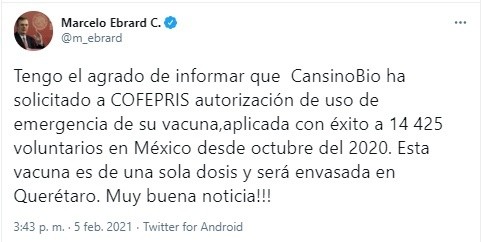 El titular de la Secretaría de Relaciones Exteriores (SRE), Marcelo Ebrard, informó este viernes que la farmacéutica china CanSino Biologics presentó una solicitud a la Comisión Federal para la Protección contra Riesgos Sanitarios (Cofepris) para que autorice el uso de emergencia de su vacuna contra COVID-19 en México.En redes sociales, el canciller indicó que esto es una “muy buena noticia”. Señaló que una vez se obtenga la autorización, el biológico de una sola dosis, será envasado en el estado de Querétaro.Ebrard explicó que el laboratorio ya ha probado la vacuna con éxito en más de 14 mil personas voluntarias en el país desde octubre.“Tengo el agrado de informar que CansinoBio ha solicitado a COFEPRIS autorización de uso de emergencia de su vacuna, aplicada con éxito a 14 mil 425 voluntarios en México desde octubre del 2020. Esta vacuna es de una sola dosis y será envasada en Querétaro. Muy buena noticia!!!”, escribió. NR