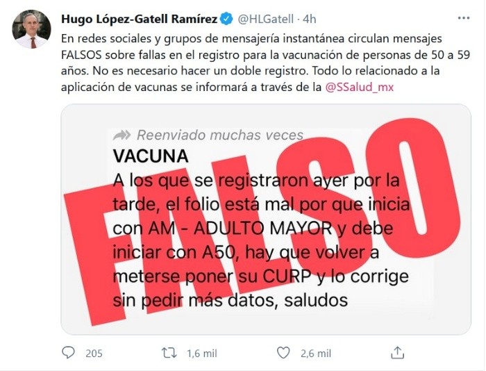 "En redes sociales y grupos de mensajería instantánea circulan mensajes FALSOS sobre fallas en el registro para la vacunación de personas de 50 a 59 años. No es necesario hacer un doble registro. Todo lo relacionado a la aplicación de vacunas se informará a través de la @Ssalud_mx", publicó el funcionario en su cuenta de Twitter.