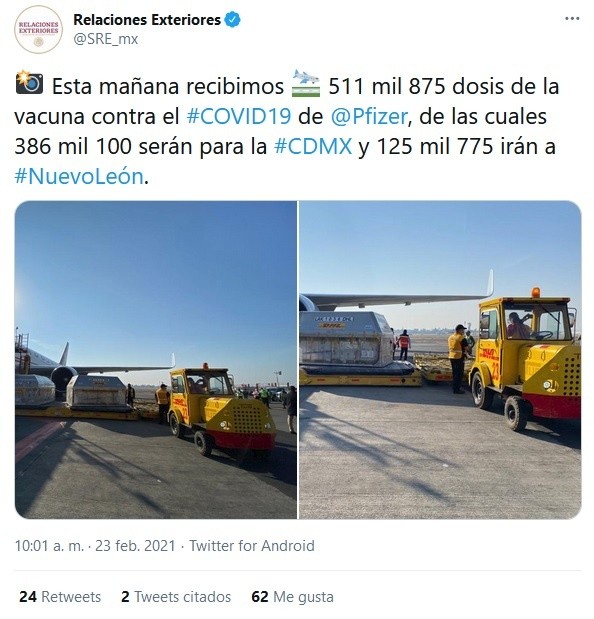 Pedro Zenteno Santaella, director de Birmex, informó desde el Aeropuerto Internacional de la Ciudad de México la llegada de otro embarque con 511 mil 875 vacunas de Pfizer BioNTech, contra el coronavirus COVID-19.Durante un enlace en Palacio Nacional, el funcionario detalló que de estas dosis, 386 mil 100 se quedarán en la Ciudad de México y 125 mil 775 se enviarán a Nuevo León a fin de aplicar segundas dosis a personal de salud que atiende a pacientes con COVID-19.A su vez, el Presidente Andrés Manuel López Obrador (AMLO) celebró que sigan llegando vacunas al país y enfatizó que el plan de vacunación contra coronavirus no se va a detener, previó que para abril, todos los adultos mayores de México cuenten con al menos la primera dosis del biológico."Ya se inició el plan de vacunación, no se va a detener, ya estamos a punto de terminar vacunación de personal de salud que está en hospitales COVID, ya están vacunados casi todos los que están salvando vidas, arriesgando sus vidas, eso fue lo primero y empezamos vacunación de adultos mayores porque se asegura que si se vacuna a adultos mayores de 60 años se logra reducir mortalidad por COVID en 80%, pensamos que para abril tendremos vacunados cuando menos con una dosis a todos los adultos mayores del país".AMLO enfatizó que la vacuna contra COVID-19 es de carácter universal y gratuita, "así como se está haciendo en Argentina y vamos hacia adelante enfrentando la crisis sanitaria y económica y vamos a salir porque es mucha la fortaleza de Argentina, del pueblo de México, hemos enfrentado muchas adversidades, calamidades de todo tipo y siempre se sale adelante", dijo.OA