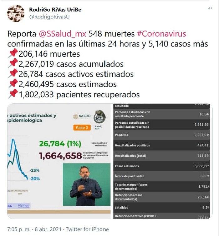 México reportó 548 nuevas muertes por coronavirus en las últimas 24 horas para acumular un total de 206 mil 146 fallecimientos por la enfermedad, informó este jueves la Secretaría de Salud.Las autoridades sanitarias también reportaron cinco mil 140 nuevos contagios en su informe técnico diario sobre la incidencia del coronavirus, para un total de dos millones 268 mil 019 casos confirmados.El director general de Epidemiología de la Secretaría de Salud, José Luis Alomía, informó en conferencia que desde el comienzo de la pandemia han sido estudiados en México 6.1 millones de pacientes.Indicó que el número de casos estimados es de dos millones 460 mil 495 al considerar aquellos que esperan el resultado de la prueba. Entre ellos, hay 26 mil 784 casos activos estimados; es decir, el 1 %, que han presentado síntomas en los últimos 14 días.Además, reportó un millón 802 mil 033 personas en el país que se consideran recuperadas después de haber padecido la enfermedad.El funcionario señaló que la ocupación nacional media de camas generales es del 17 % y en cuanto a camas de terapia intensiva con respirador existe una ocupación nacional del 22 por ciento.En la conferencia se explicó que hasta este día se han administrado entre la población 10 millones 642 mil 873 dosis de la vacuna contra el coronavirus, 334 mil 359 en las últimas 24 horas.Apenas el miércoles, México aplicó 530 mil 178 dosis, récord para un solo día.Además se informó que un total de un millón 664 mil 658 personas han recibido las dos dosis necesarias para completar el esquema de vacunación.JM