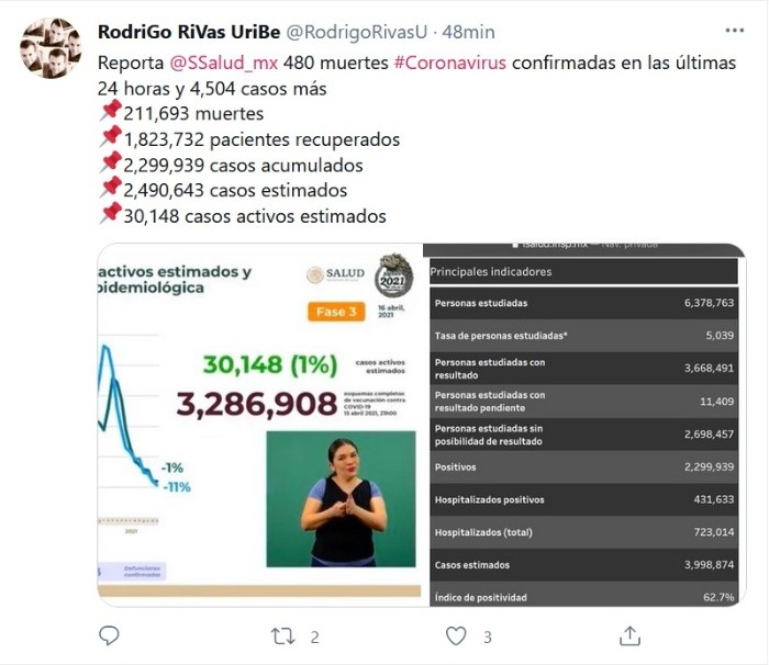 México acumula, hasta este viernes, 211 mil 693 muertes por COVID-19, según informan autoridades de la Secretaría de Salud. En las últimas 24 horas, México sumó 480 decesos por el nuevo coronavirus.