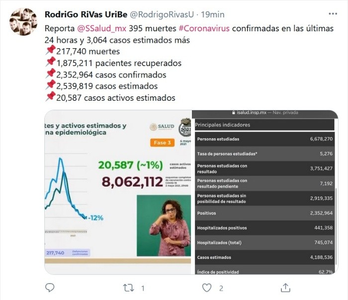 Con estas cifras, México ocupa el decimoquinto lugar mundial en número de contagios y el cuarto puesto con más decesos por la pandemia, detrás de Estados Unidos, Brasil y la India según la Universidad estadounidense Johns Hopkins.