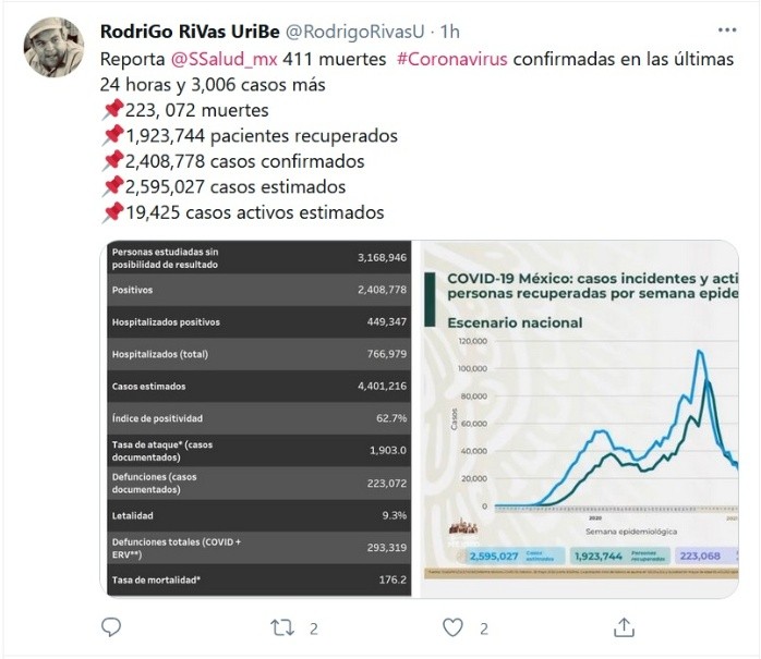 México sumó 411 nuevas muertes por COVID-19 en las últimas 24 horas, con lo que llegó a un total de 223 mil 068 decesos, además de tres mil 006 contagios que elevan a dos millones 408 mil 778 los casos confirmados, informó este viernes la Secretaría de Salud.Con estos datos, México se ubica como el cuarto país del mundo con más decesos, por detrás de Estados Unidos, Brasil e India, y el decimoquinto en número de contagios confirmados, según el recuento de la Universidad Johns Hopkins.Desde el comienzo de la emergencia sanitaria, México ha estudiado 7.01 millones de pacientes, informó la directora de Investigación Operativa Epidemiológica, Ana Lucía de la Garza, en conferencia de prensa en Palacio Nacional.Indicó que el número de casos estimados es de dos millones 595 mil 027 al considerar aquellos que esperan el resultado de la prueba, entre los cuales hay 19 mil 425 casos activos estimados, es decir, menos del 1 %, que han presentado síntomas en los últimos 14 días.Además, reportó un millón 923 mil 744 personas que se consideran recuperadas después de haber padecido la enfermedad.La ocupación media de camas generales en los hospitales mexicanos es del 13 % y del 14 % en cuanto a camas de terapia intensiva con respirador. La ocupación hospitalaria ha disminuido un 87 % respecto al pico máximo alcanzado en enero.Con respecto a las defunciones, Ciudad de México, el foco de la pandemia, acumula el 19.2 % de todos los decesos a nivel nacional, es decir, casi una de cada cinco muertes.JM