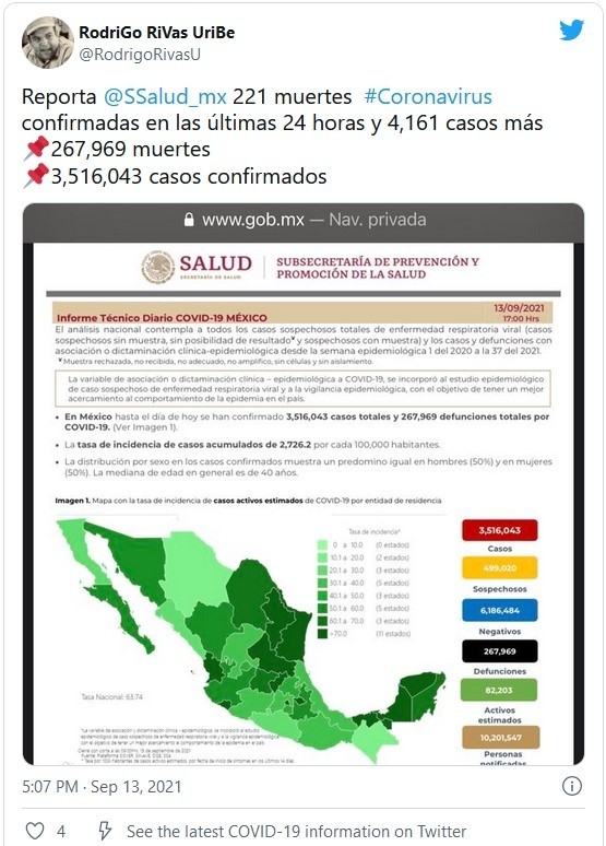 La Secretaría de Salud reportó este lunes 221 nuevas muertes por COVID-19 para un total de 267 mil 969 defunciones, además de otros cuatro mil 161 nuevos casos para llegar a tres millones 516 mil 043 contagios, durante la actual tercera ola de la pandemia en el país.Con estos registros, México se mantiene como el cuarto país con más muertes por COVID-19 por detrás de Estados Unidos, Brasil y la India, y el decimoquinto en número de contagios confirmados, según el recuento de la Universidad Johns Hopkins.Apenas el pasado sábado, el país superó los 3.5 millones de casos acumulados desde el inicio de la pandemia en medio de la tercera ola de infecciones, que afecta al país desde hace tres meses.Informan que aproximadamente hay 82 mil 203 casos activos; es decir, aquellos que han presentado síntomas durante los últimos 14 días y que suponen el 2.2 por ciento del total.Además, desde el inicio de la pandemia se han recuperado dos millones 865 mil 218 personas; asimismo, detallan que la ocupación media de camas generales es del 41 % y del 37 % para camas de terapia intensiva.Las autoridades también indicaron que el programa de vacunación, que contempla a todos los mayores de 18 años, acumula 92.08 millones de dosis de la vacuna anticovid aplicadas, al sumar 355 mil 380 en la última jornada.El reporte también precisó que cerca de 39.31 millones de personas han completado el esquema de vacunación, del total de 126 millones de habitantes que tiene el país.Si te interesó esta noticia y quieres saber más, entonces descarga y descubre INFORMAPlus, la aplicación digital de EL INFORMADOR, en donde tenemos contenidos exclusivos, seleccionados por nuestros editores, para darles una experiencia más completa a los lectores. Si eres suscriptor de EL INFORMADOR tu acceso está incluido, solicítalo al 33 3678-7777.Descarga la aplicación y pruébala GRATIS por treinta días.Para iOS: https://apple.co/35jaVgbPara Android: https://bit.ly/3gwVSEVJM