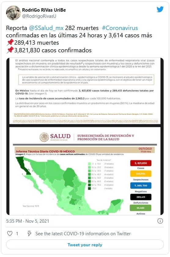 La Secretaría de Salud reportó este viernes 282 nuevas muertes por COVID-19 para un total de 289 mil 413 defunciones confirmadas, además de otros tres mil 614 casos para llegar hasta los tres millones 821 mil 830 contagios detectados.Con estos datos, México se mantiene como el cuarto país con más muertes por el virus, detrás de Estados Unidos, Brasil y la India, y el decimoquinto en número de contagios confirmados, según el recuento de la Universidad Johns Hopkins.De la cifra oficial total de contagios, 23 mil 460 son los casos activos, que han presentado síntomas durante los últimos 14 días y suponen el 0.6 %. Además, desde el inicio de la pandemia se han recuperado tres millones 184 mil 715 personas.La ocupación media de camas generales es del 19 % y del 16 % para camas de terapia intensiva.Las autoridades también indicaron que el programa de vacunación, que contempla a todos los mayores de 18 años, acumula más de 127.42 millones de dosis aplicadas, al sumar 539 mil 196 durante la última jornada.Hasta ahora, 74.78 millones de personas mayores de 18 años tienen al menos una dosis. Es decir, el 84 % del total de la población adulta. De ese total, el 82 % (61.49 millones) ha recibido el esquema completo.JM