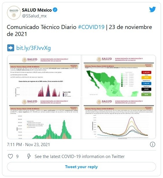 La Secretaría de Salud reportó este martes 326 nuevas muertes por COVID-19 para un total de 292 mil 850 confirmadas, además de otros tres mil 698 casos para llegar hasta los tres millones 867 mil 976 detectados.Las autoridades sanitarias reconocen que, con base en las actas de defunción, la pandemia rondaría los 440 mil fallecidos en el país y estiman que México acumula en realidad cuatro millones 089 mil 748 contagios.De esta cifra, 19 mil 018 son los casos activos, que han presentado síntomas durante los últimos 14 días y suponen el 0.7 % del total. Además, desde el inicio de la pandemia se han recuperado tres millones 229 mil 463 personas.La ocupación media de camas generales en los hospitales mexicanos se mantiene en 17 %, y el uso de camas de terapia intensiva en 13 por ciento.Las autoridades también indicaron que el programa de vacunación, que contempla a todos los mayores de 18 años, acumula más de 131.19 millones de dosis aplicadas, al sumar 116 mil 552 durante la última jornada.Hasta ahora, 75.9 millones de personas tienen al menos una dosis y casi 64.39 millones han completado el esquema de vacunación; es decir, poco más de la mitad de sus 126 millones de habitantes.JM