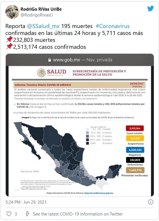 México reportó 195 nuevas muertes por COVID-1919 en las últimas 24 horas, para un total de 232 mil 803 decesos, informó este martes la Secretaría de Salud, que también indicó que el país llegó a 44.38 millones de vacunas aplicadas.Además, el informe técnico diario registró cinco mil 711 nuevos contagios que elevan a dos millones 513 mil 164 los casos confirmados.Con estas cifras, México se sitúa como el cuarto país con más decesos, por detrás de Estados Unidos, Brasil e India, y el decimoquinto en número de contagios confirmados, según el recuento de la Universidad Johns Hopkins.El reporte de este martes indicó que, desde el comienzo de la emergencia, México ha estudiado 7.49 millones de pacientes.Además, las autoridades sanitarias estiman que el número real de contagios es de dos millones 699 mil 175. De esta cifra están activas 35 mil 288 personas que han presentado síntomas durante los últimos 14 días y que representan poco más del 1 % del total.También se reportó que un millón 997 mil 381 personas se consideran recuperadas después de haber padecido la enfermedad.La ocupación media de camas generales en los hospitales mexicanos es del 18 % y del 15 % para camas de terapia intensiva.Con respecto a las defunciones, Ciudad de México -el foco de la pandemia- acumula el 19.1 % de todos los decesos a nivel nacional, es decir, casi una de cada cinco muertes.El informe indicó que hasta ahora se han administrado 44.38 millones de dosis de la vacuna anticovid, al sumar 463 mil 718 en la jornada del lunes.Además, indicó que 19.12 millones de personas han recibido las dosis necesarias para completar el esquema de vacunación en México, que tiene 126 millones de habitantes.JM