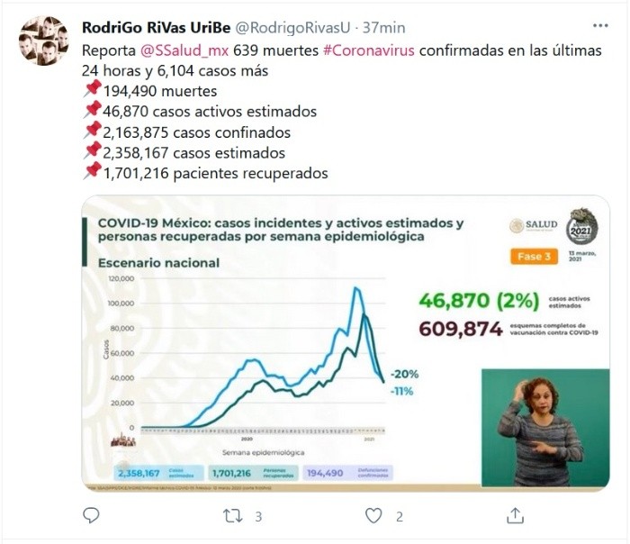 La Secretaría de Salud (Ssa) informó que al corte de este sábado 13 de marzo, México sumó seis mil 104 casos confirmados de COVID-19, para dar un total de dos millones 163 mil 875 infecciones.