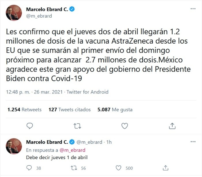 La Secretaría de Relaciones Exteriores (SRE) confirmó este viernes que el próximo 1 de abril llegarán a México 1.2 millones de dosis de la vacuna AstraZeneca provenientes de Estados Unidos, con lo que se completarán las 2.7 millones de dosis que ha prometido el Gobierno estadounidense para el país."Les confirmo que el 2 de abril llegarán 1.2 millones de dosis de la vacuna AstraZeneca desde los EU que se sumarán al primer envío del próximo domingo para alcanzar 2.7 millones de dosis", informó el canciller Marcelo Ebrard en un mensaje en Twitter. "Debe decir jueves 1 de abril", corrigió posteriormente el funcionario.Ebrard aprovechó también para mostrar el agradecimiento de México por "este gran apoyo del gobierno del presidente (Joe) Biden contra el COVID-19".El jueves, el Gobierno de México anunció que este domingo llegaría el primer embarque de vacunas anticovid de AstraZeneca, producidas en Estados Unidos, fruto de un acuerdo entre los Gobiernos de ambos países.El 18 de marzo, ambas administraciones cerraron un trato para que México tuviera acceso a vacunas de AstraZeneca producidas en EU, país que todavía no ha autorizado el uso del fármaco británico, del que tiene un stock de siete millones de dosis.JM