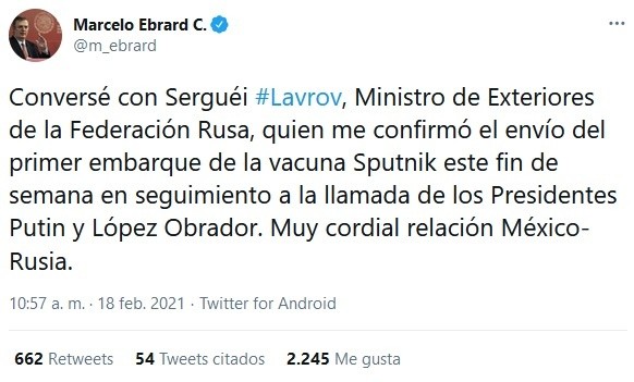 Marcelo Ebrard, secretario de Relaciones Exteriores, informó este jueves que México recibirá este fin de semana el primer cargamento de las 24 millones de dosis de la vacunas Sputnik V contra el coronavirus COVID-19 compradas a Rusia.Ebrard anunció en redes sociales: "Conversé con Serguéi Lavrov, ministro de Exteriores de la Federación Rusa, quien me confirmó el envío del primer embarque de la vacuna Sputnik este fin de semana".Ebrard aseguró que este envío da "seguimiento a la llamada" que mantuvieron el Presidente Andrés Manuel López Obrador (AMLO), y su homólogo ruso, Vladimir Putin, el pasado enero en la que cerraron la compra de 24 millones de la vacuna.La Embajada de Rusia en México confirmó por su parte la llamada entre Ebrard y Lavrov de este jueves en la que "se abordaron temas de cooperación bilateral, sobre todo el suministro a México de la vacuna Sputnik V"."Los cancilleres discutieron el estado actual de las relaciones bilaterales y las posibilidades de intensificar la cooperación entre Rusia", detalló la Embajada en Twitter.La Comisión Federal para la Protección contra Riesgos Sanitarios (Cofepris) autorizó el pasado 2 de febrero el uso de la vacuna rusa en México después de una visita del subsecretario de Salud Hugo López-Gatell a Argentina, donde dio seguimiento a la aplicación de la Sputnik V.El 25 de enero, López Obrador, confinado en el Palacio Nacional tras haber contraído COVID-19, llamó a Putin para cerrar la compra de 24 millones de dosis de la vacuna Sputnik V, que empezarán a llegar este fin de semana.México inició el lunes la segunda fase del plan de vacunación con la inmunización de adultos mayores de 60 años con vacunas de AstraZeneca, cuando todavía no ha concluido la vacunación de personal médico con las dosis de Pfizer.De momento, se han aplicado un millón 058 mil 139 vacunas contra COVID-19 pero solo 99.666 personas han recibido las dos dosis necesarias para la inmunidad.El país, con 126 millones de habitantes, tiene comprometidos 34.4 millones de dosis de la estadounidense Pfizer, 79.4 de la británica AstraZeneca, 35 de la china CanSino, 24 de la rusa Sputnik V, 10 de la china Sinovac y 51.4 de la plataforma COVAX de la Organización Mundial de la Salud (OMS).Con 175 mil muertos y los dos millones de contagios, México es el tercer país del mundo con más decesos por la pandemia, detrás de Estados Unidos y Brasil.OA
