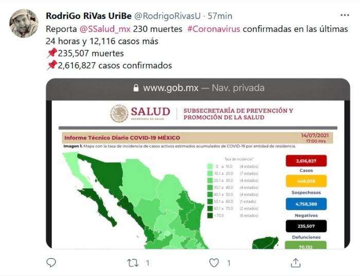 Al corte de este miércoles 14 de julio, México acumuló 235 mil 507 muertes por COVID-19, esto es, 230 fallecimientos más que el día anterior, informó la Secretaría de Salud (Ssa).Asimismo, se detalló que en las últimas 24 horas el país sumó 12 mil 116 contagios, para dar un total de dos millones 616 mil 827 casos confirmados.En el informe técnico, la dependencia indicó que las 10 entidades que acumulan el mayor número de casos son la Ciudad de México, el Estado de México, Guanajuato, Nuevo León, Jalisco, Puebla, Sonora, Tabasco, Querétaro y Coahuila, los cuales conforman el 66% de todos los casos acumulados registrados en el país.Con estas cifras, México ocupa el decimoquinto lugar mundial en número de contagios y el cuarto puesto como el país con más decesos por la pandemia, detrás de Estados Unidos, Brasil y la India, según la Universidad estadounidense Johns Hopkins.Respecto a los detalles del plan de vacunación, el subsecretario de Prevención y Promoción de la Salud, Hugo López-Gatell, informó que al corte de las 21:00 horas del martes a nivel nacional fueron aplicadas 654 mil 835 dosis de la vacuna contra el COVID-19.Informó además, que desde el inicio de la estrategia nacional de vacunación se han aplicado en total 51 millones 986 mil 413 dosis.JM