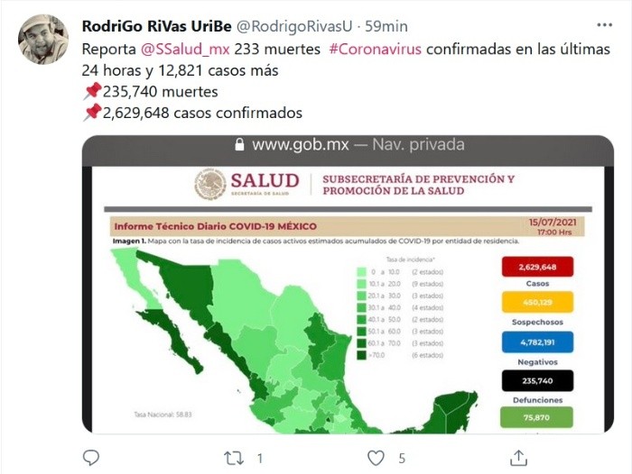 Al corte de este jueves 15 de julio, México acumuló 235 mil 740 muertes por COVID-19; esto es, 233 fallecimientos más que el día anterior, informó la Secretaría de Salud (Ssa). Asimismo, se detalló que en las últimas 24 horas, el país sumó 12 mil 821 contagios, para dar un total de dos millones 629 mil 648 casos confirmados.En el informe técnico, la dependencia indicó que las 10 entidades que acumulan el mayor número de casos son la Ciudad de México, el Estado de México, Guanajuato, Nuevo León, Jalisco, Puebla, Sonora, Tabasco, Querétaro y Veracruz, los cuales conforman el 66% de todos los casos acumulados registrados en el país.Con estas cifras, México ocupa el decimoquinto lugar mundial en número de contagios y el cuarto puesto como el país con más decesos por la pandemia, detrás de Estados Unidos, Brasil y la India, según la Universidad estadounidense Johns Hopkins.Respecto a los detalles del plan de vacunación, el subsecretario de Prevención y Promoción de la Salud, Hugo López-Gatell, informó que al corte de las 21:00 horas del miércoles a nivel nacional fueron aplicadas 698 mil 554 dosis de la vacuna contra el COVID-19.Informó además, que desde el inicio de la estrategia nacional de vacunación se han aplicado en total 52 millones 704 mil 960 dosis.JM