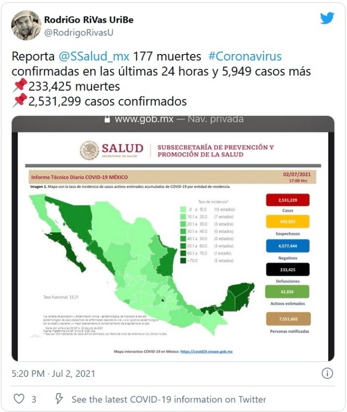 México registró 177 nuevas muertes por COVID-19 en las últimas 24 horas, para un total de 233 mil 425 decesos, informó este viernes la Secretaría de Salud, que también indicó que el país llegó a 46.5 millones de vacunas aplicadas.Además, el informe técnico diario registró cinco mil 879 nuevos contagios que elevan a dos millones 531 mil 229 los casos confirmados.Con estas cifras, México se mantiene como el cuarto país del mundo con más decesos, detrás de Estados Unidos, Brasil y la India, y es decimoquinto en número de contagios confirmados, según el recuento de la Universidad Johns Hopkins.Sin embargo, el Gobierno mexicano reconoció a finales de abril que las muertes asociadas al COVID-19 son en realidad poco más de 332 mil 500, tras un análisis de las actas de defunción.Además, las autoridades sanitarias estiman que el número real de contagios es de dos millones 717 mil 936.De esta cifra están activos 42 mil 826 casos de personas que han presentado síntomas durante los últimos 14 días y que representan poco más del 1.6% del total.La ocupación media de camas generales en los hospitales mexicanos es del 19% y del 16% para camas de terapia intensiva.De los 32 estados del país, 19 están en semáforo epidemiológico verde (bajo riesgo de contagios), ocho en amarillo (riesgo medio), cinco en naranja (riesgo alto) y ninguno en rojo (riesgo máximo).El informe indicó también que hasta ahora se han administrado 46.5 millones de dosis de la vacuna contra COVID-19, al sumar 551 mil 751 en la última jornada.Además, precisó que 19.7 millones de personas han recibido las dosis necesarias para completar el esquema de vacunación en México, que tiene 126 millones de habitantes.IM
