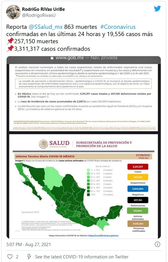 Al corte de este viernes 27 de agosto, México acumuló 257 mil 150 muertes por COVID-19; esto es, 863 fallecimientos más que el día anterior, informó la Secretaría de Salud. Asimismo se detalló que en las últimas 24 horas el país sumó 19 mil 556 contagios, para dar un total de tres millones 311 mil 317 casos confirmados.Con estas cifras, México ocupa el lugar 14 a nivel mundial en número de contagios y el cuarto puesto como el país con más decesos por la pandemia, detrás de Estados Unidos, Brasil y la India, según la Universidad estadounidense Johns Hopkins.A través del informe técnico, la dependencia indicó que las 10 primeras entidades que acumulan el mayor número de casos son: Ciudad de México, Estado de México, Nuevo León, Guanajuato, Jalisco, Tabasco, Puebla, Veracruz Sonora y San Luis Potosí, que en conjunto conforman el 66% de todos los casos acumulados registrados en el país.Respecto a los detalles del plan de vacunación, el subsecretario de Prevención y Promoción de la Salud, Hugo López-Gatell, informó a través de Twitter que el jueves 26 de agosto se aplicaron 754 mil 860 dosis de vacunas anticovid. Detalló además, que desde el inicio de la estrategia nacional de vacunación se han aplicado en total 83 millones 433 mil 577 dosis de la vacuna.Si te interesó esta noticia y quieres saber más, entonces descarga y descubre INFORMAPlus, la aplicación digital de EL INFORMADOR, en donde tenemos contenidos exclusivos, seleccionados por nuestros editores, para darles una experiencia más completa a los lectores. Si eres suscriptor de EL INFORMADOR tu acceso está incluido, solicítalo al 33 3678-7777Descarga la aplicación y pruébala GRATIS por treinta días.Para iOS: https://apple.co/35jaVgbPara Android: https://bit.ly/3gwVSEVJM