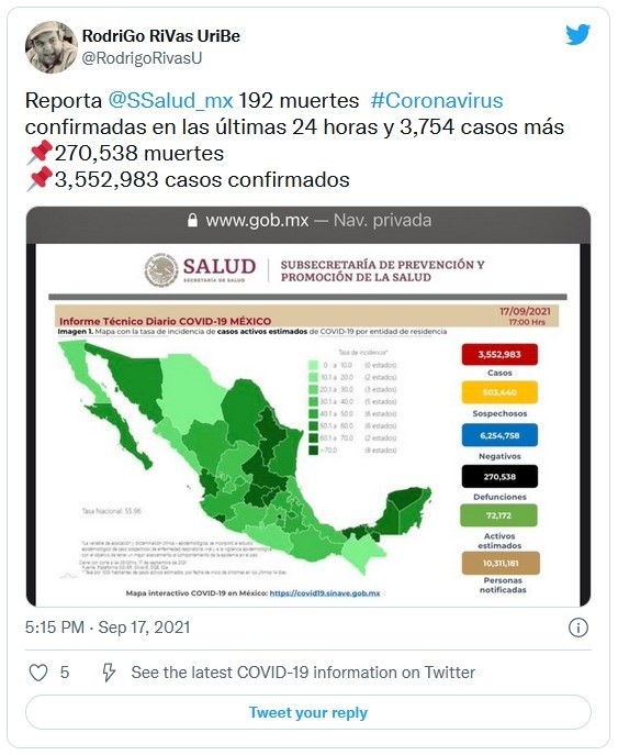 Al corte de este viernes 17 de septiembre, México acumuló 270 mil 538 muertes por COVID-19; esto es, 192 fallecimientos más que el día anterior, informó la Secretaría de Salud.Asimismo, se detalló que en las últimas 24 horas, el país sumó tres mil 754 contagios, para dar un total de tres millones 552 mil 983 casos confirmados.A través del informe técnico, las autoridades sanitarias detallaron que las 10 primeras entidades que acumulan el mayor número de casos son Ciudad de México, Estado de México, Nuevo León, Guanajuato, Jalisco, Tabasco, Puebla, Veracruz, Sonora y San Luis Potosí, que en conjunto conforman el 66% de todos los casos acumulados registrados en el país.Respecto a los detalles del plan de vacunación, la dependencia informó que el 15 de septiembre, al corte de las 21:00 horas, fueron aplicadas 555 mil 532 dosis de las vacunas contra COVID-19.Asimismo, detalló que desde el inicio de la pandemia se han aplicado 94 millones 144 mil 251 dosis."En México, 69 por ciento de la población mayor de 18 años tiene al menos una dosis; es decir, 61 millones 573 mil 170 personas, de las cuales 40 millones 997 mil 724, que representan 67 por ciento, cuentan con esquema completo; y 33 por ciento, es decir, 20 millones 575 mil 446, tiene medio esquema de vacunación", indicó en el informe técnico.Si te interesó esta noticia y quieres saber más, entonces descarga y descubre INFORMAPlus, la aplicación digital de EL INFORMADOR, en donde tenemos contenidos exclusivos, seleccionados por nuestros editores, para darles una experiencia más completa a los lectores. Si eres suscriptor de EL INFORMADOR tu acceso está incluido, solicítalo al 33 3678-7777.Descarga la aplicación y pruébala GRATIS por treinta días.Para iOS: https://apple.co/35jaVgbPara Android: https://bit.ly/3gwVSEVJM