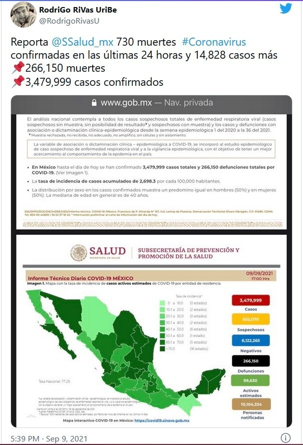 Al corte de este jueves 9 de septiembre, México acumuló 266 mil 150 muertes por COVID-19; esto es, 730 fallecimientos más que el día anterior, informó la Secretaría de Salud.Asimismo, se detalló que en las últimas 24 horas el país sumó 14 mil 828 contagios, cifra con la que se acumulan en total tres millones 479 mil 999 casos confirmados.En su informe técnico, la Secretaría de Salud informó que las 10 primeras entidades que acumulan el mayor número de casos son: Ciudad de México, Estado de México, Nuevo León, Guanajuato, Jalisco, Tabasco, Puebla, Veracruz, Sonora y San Luis Potosí, que en conjunto conforman el 66% de todos los casos acumulados registrados en el país.Además, se detalló que desde el inicio de la pandemia, dos millones 819 mil 991 personas se han recuperado de COVID-19.Respecto a los detalles del plan de vacunación, la dependencia informó que al 8 de septiembre al corte de las 21:00 horas se aplicaron 871 mil 836 vacunas contra COVID-19.Detalló además, que desde el inicio de la estrategia nacional de vacunación se han aplicado en total 89 millones 500 mil 945 biológicos.Si te interesó esta noticia y quieres saber más, entonces descarga y descubre INFORMAPlus, la aplicación digital de EL INFORMADOR, en donde tenemos contenidos exclusivos, seleccionados por nuestros editores, para darles una experiencia más completa a los lectores. Si eres suscriptor de EL INFORMADOR tu acceso está incluido, solicítalo al 33 3678-7777.Descarga la aplicación y pruébala GRATIS por treinta días.Para iOS: https://apple.co/35jaVgbPara Android: https://bit.ly/3gwVSEVJM