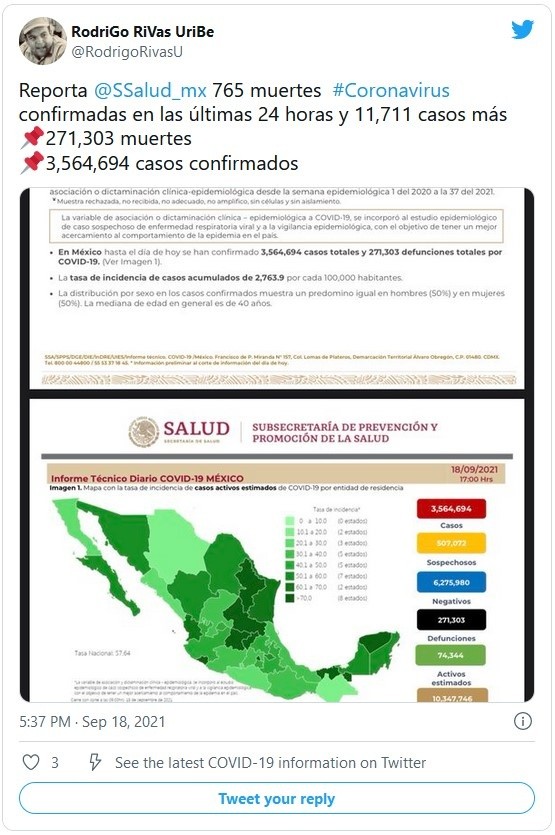 En el informe técnico diario sobre el desarrollo de la pandemia del nuevo coronavirus en México, la Secretaría de Salud informó que el país registró 11 mil 711 casos de COVID-19 durante las últimas 24 horas, con lo que suman tres millones 564 mil 694 en total.De acuerdo con el documento federal, México también registró 765 nuevas muertes a causa de la enfermedad, lo que sitúa al país en 271 mil 303 fallecimientos por COVID-19.Asimismo, las autoridades sanitarias detallaron que las 10 primeras entidades que acumulan el mayor número de casos son Ciudad de México, Estado de México, Nuevo León, Guanajuato, Jalisco, Tabasco, Puebla, Veracruz, Sonora y San Luis Potosí, que en conjunto conforman el 66% de todos los casos acumulados registrados en el país.Hasta el 15 de septiembre, indicó la Secretaría de Salud, se han aplicado 94 millones 144 mil 251 dosis de la vacuna contra el COVID-19.Esto representa que el 69% de la población mayor de 18 años tiene al menos una dosis del antídoto. De las 61 millones 573 mil 170 personas inoculadas, 40 millones 997 mil 724 cuentan con su esquema completo de vacunación, mientras que 20 millones 575 mil 446 tienen al menos una vacuna contra la enfermedad.Si te interesó esta noticia y quieres saber más, entonces descarga y descubre INFORMAPlus, la aplicación digital de EL INFORMADOR, en donde tenemos contenidos exclusivos, seleccionados por nuestros editores, para darles una experiencia más completa a los lectores. Si eres suscriptor de EL INFORMADOR tu acceso está incluido, solicítalo al 33 3678-7777.Descarga la aplicación y pruébala GRATIS por treinta días.Para iOS: https://apple.co/35jaVgbPara Android: https://bit.ly/3gwVSEVJM