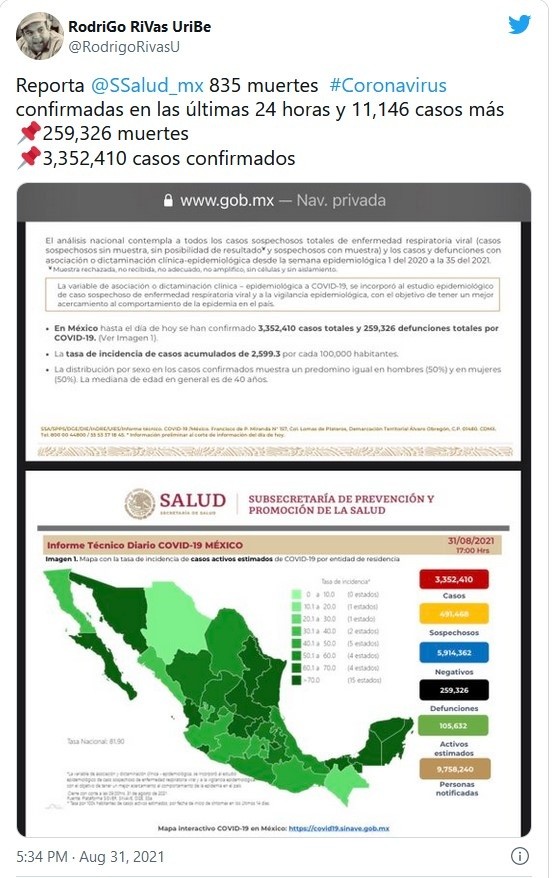 En su informe técnico diario, la Secretaría de Salud informó que, al corte de este martes 31 de agosto, México acumuló 259 mil 326 muertes por COVID-19. Esto significa que el país registró 835 decesos por esta enfermedad más que el lunes.Además, el país sumó tres millones 352 mil 410 casos positivos por coronavirus, al reportar 11 mil 146 contagios en las últimas 24 horas. También contabilizó 491 mil 468 casos sospechosos y cinco millones 914 mil 362 casos negativos.Sobre los casos activos en el país, la dependencia federal registró 98 mil 39 y estimó 105 mil 632. Salud considera a los casos activos como aquellos que iniciaron síntomas en los últimos 14 días. En las últimas cinco semanas, detalló, la mayor parte de los casos están presentes en los grupos de 18 a 29 años, seguido del grupo de 30 a 39 años y 40 a 49 años.Por su parte, el subsecretario de Prevención y Promoción de la Salud, Hugo López-Gatell, dio a conocer que de 32 estados, 30 registran descenso en su curva epidémica y también está disminuyendo la ocupación hospitalaria.El subsecretario López-Gatell difundió que ayer lunes, 30 de agosto, se aplicaron 397 mil 361 dosis de vacunas contra el coronavirus.Hasta este martes, en México suman 84 millones 946 mil 443 dosis suministradas. El avance en la vacunación, aseguró, ayuda a que el regreso a clases presenciales sea seguro.Si te interesó esta noticia y quieres saber más, entonces descarga y descubre INFORMAPlus, la aplicación digital de EL INFORMADOR, en donde tenemos contenidos exclusivos, seleccionados por nuestros editores, para darles una experiencia más completa a los lectores. Si eres suscriptor de EL INFORMADOR tu acceso está incluido, solicítalo al 33 3678-7777Descarga la aplicación y pruébala GRATIS por treinta días.Para iOS: https://apple.co/35jaVgbPara Android: https://bit.ly/3gwVSEVJM