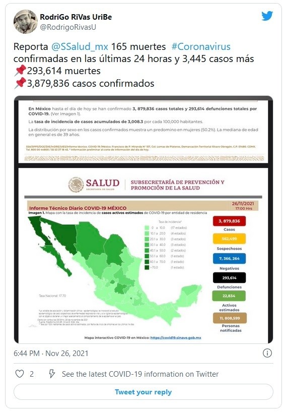 La Secretaría de Salud reportó este viernes 165 nuevas muertes por COVID-19 para un total de 293 mil 614 defunciones confirmadas, además de otros tres mil 445 casos para llegar a tres millones 879 mil 836 contagios.De igual manera, en su actualización del semáforo epidemiológico, detallan que Baja California, Baja California Sur, Sonora, Chihuahua y Coahuila regresarán al color amarillo del 29 de noviembre al 12 de diciembre.De la cifra de casos, hay 22 mil 834 activos, que han presentado síntomas durante los últimos 14 días y suponen el 0.6 % del total. Además, desde el inicio de la pandemia se han recuperado tres millones 236 mil 518 personas.La ocupación media de camas generales se mantiene en 17 % y el uso de camas de terapia intensiva en 14 por ciento.Las autoridades también indicaron que dentro del programa de vacunación, que contempla a todos los mayores de 18 años, se han aplicado más de 131.82 millones de dosis, al sumar 228 mil 705 durante la última jornada. Hasta ahora, 76.29 millones de personas mayores de 18 años tienen al menos una dosis del biológico.De acuerdo con el informe técnico diario emitido por la Secretaría de Salud, Baja California, Baja California Sur, Sonora, Chihuahua y Coahuila regresaron a amarillo, a excepción de Baja California que durante la última actualización se encontraba en color naranja.En medio de la incertidumbre causada por la nueva variante del COVID-19, ómicron, la dependencia a cargo de Jorge Alcocer Varela mantiene a 27 estados del país con el riesgo epidémico bajo; es decir, en color verde, y ninguno en rojo o naranja.De acuerdo con la información de la dependencia, los estados con color amarillo deberán mantener una ligera disminución en el espacio público, además de la operación actividades económicas y sociales con un aforo de 75 por ciento.En cualquier espacio cerrado el uso de cubrebocas será obligatorio y será recomendado en espacios abiertos sin posibilidad de mantener sana distancia y obligatorio en el transporte público.JM