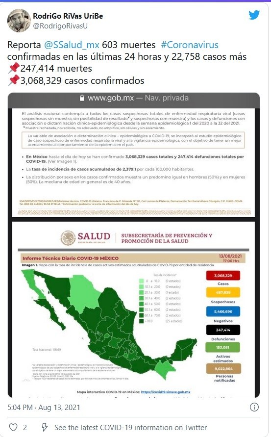 La Secretaría de Salud reportó este viernes 22 mil 758 nuevos contagios confirmados de COVID-19 en la última jornada, el segundo máximo diario durante la pandemia, para totalizar tres millones 068 mil 329 casos, además de 603 nuevas muertes hasta alcanzar 247 mil 414.Los registros de los últimos tres días, con máximos contagios, ocurren en medio de la tercera ola en el país. El jueves se reportaron 24 mil 975, el máximo, pero los 22 mil 758 de este viernes rebasaron los 22 mil 711 casos del miércoles.Por segunda jornada consecutiva se reportó un récord de casos activos con 153 mil 081, superando los 146 mil 525 del jueves.Las autoridades sanitarias creen que, con base en las actas de defunción, la pandemia ha dejado más de 350 mil muertos en el país y estiman que México acumula en realidad tres millones 274 mil 944 casos de contagio.De esta cifra, 153 mil 081 son los casos activos, que han presentado síntomas durante los últimos 14 días y que suponen el 4.7 % del total.Desde el inicio de la pandemia se han recuperado dos millones 405 mil 433 personas.La ocupación media de camas generales es del 54 %, y del 47 % para camas de terapia intensiva.Las autoridades también indicaron que hasta ahora el programa de vacunación, que contempla a todos los mayores de 18 años, ha administrado 75.78 millones de dosis de la vacuna anticovid, al sumar 977 mil 450 en la última jornada.El reporte también precisó que 28.74 millones de personas han completado el esquema de vacunación, de 126 millones de habitantes que tiene el país.Desde el 23 de diciembre de 2020 el país ha recibido en total 92.11 millones de dosis de la británica AstraZeneca, la rusa Sputnik V, las estadounidenses Pfizer y Johnson & Johnson, además de las chinas CanSino y Sinovac.Si te interesó esta noticia y quieres saber más, entonces descarga y descubre INFORMAPlus, la aplicación digital de EL INFORMADOR, en donde tenemos contenidos exclusivos, seleccionados por nuestros editores, para darles una experiencia más completa a los lectores. Si eres suscriptor de EL INFORMADOR tu acceso está incluido, solicítalo al 33 3678-7777Descarga la aplicación y pruébala GRATIS por treinta días.Para iOS: https://apple.co/35jaVgbPara Android: https://bit.ly/3gwVSEVJM