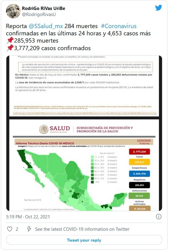 La Secretaría de Salud reportó este viernes 284 nuevas muertes por el COVID-19 para un total de 285 mil 953 defunciones, además de otros cuatro mil 653 nuevos casos para llegar hasta los tres millones 777 mil 209.Con estos datos, México se mantiene como el cuarto país con más muertes por el virus, detrás de Estados Unidos, Brasil y la India, y el decimoquinto en número de contagios confirmados, según el recuento de la Universidad Johns Hopkins.De la cifra oficial total de contagios, 33 mil 745 son los casos activos, que han presentado síntomas durante los últimos 14 días y suponen el 0.8 %. Además, desde el inicio de la pandemia se han recuperado tres millones 137 mil 453 personas.La ocupación media de camas generales es del 22 % y del 21 % para camas de terapia intensiva.Las autoridades también indicaron que el programa de vacunación, que contempla a todos los mayores de 18 años, acumula más de 113.96 millones de dosis aplicadas al sumar 486 mil 395 durante la última jornada.Hasta ahora, 69.72 millones de personas mayores de 18 años tienen al menos una dosis. Es decir, el 78 % del total de la población adulta. De ese total, el 75 % (52.49 millones) ha recibido el esquema completo.JM