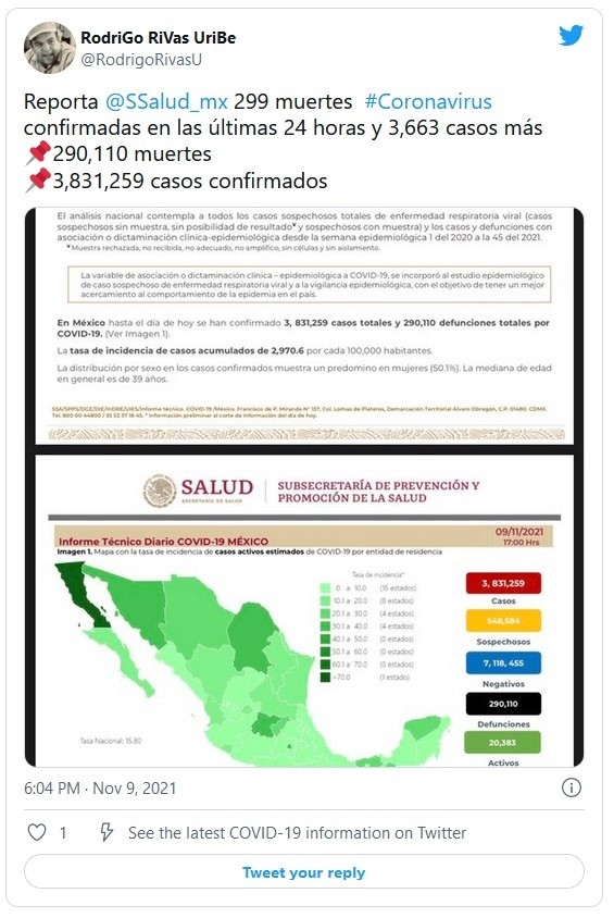 La Secretaría de Salud registró este martes 299 nuevas muertes por COVID-19 para un total de 290 mil 110 defunciones confirmadas, además de otros tres mil 663 casos para llegar hasta los tres millones 831 mil 259 contagios detectados.México se mantiene como el cuarto país con más muertes por el virus, detrás de Estados Unidos, Brasil y la India, y el decimoquinto en número de contagios confirmados, según el recuento de la Universidad Johns Hopkins.De la cifra oficial total de contagios, 20 mil 383 son los casos activos, que han presentado síntomas durante los últimos 14 días y suponen el 0.5 %. Además, desde el inicio de la pandemia se han recuperado tres millones 195 mil 737 personas.La ocupación media de camas generales es del 17 % y del 15 % para camas de terapia intensiva.Las autoridades también indicaron que el programa de vacunación, que contempla a todos los mayores de 18 años, acumula más de 128.62 millones de dosis aplicadas, al sumar 271 mil 457 durante la última jornada.Hasta ahora, 75.02 millones de personas mayores de 18 años tienen al menos una dosis. Es decir, el 84 % del total de la población adulta. De ese total, el 83 % (62.48 millones) ha recibido el esquema completo.JM