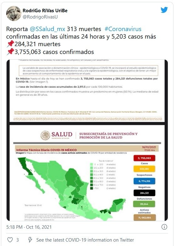 La Secretaría de Salud federal reportó este sábado 313 nuevas muertes por COVID-19 para un total de 284 mil 321 defunciones, además de otros cinco mil 203 nuevos casos para llegar hasta los tres millones 755 mil 063 contagios.Con estas cifras, México se mantiene como el cuarto país con más muertes por COVID-19, detrás de Estados Unidos, Brasil y la India, y el decimoquinto en número de contagios confirmados, según el recuento de la Universidad Johns Hopkins.Autoridades calculan que hay 39 mil 244 casos activos, que han presentado síntomas durante los últimos 14 días y que suponen el 0.9 %. Además, desde el inicio de la pandemia se han recuperado tres millones 113 mil 350 personas.La ocupación media de camas generales es del 25 % y del 22 % para camas de terapia intensiva.Las autoridades también indicaron que el programa de vacunación, que contempla a todos los mayores de 18 años, acumula más de 111.4 millones de dosis aplicadas al sumar 849 mil 598 durante la última jornada.Hasta ahora, 68.35 millones de personas mayores de 18 años tienen al menos una dosis. Es decir, el 76 % del total de la población adulta. De ese total, el 75 % (51.3 millones) ha recibido el esquema completo.JM