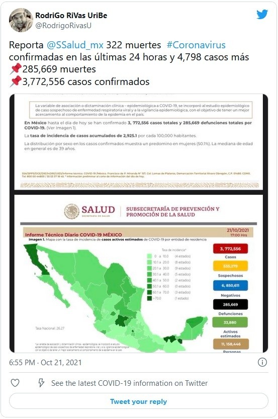La Secretaría de Salud reportó este jueves 424 nuevas muertes por el nuevo coronavirus para un total de 285 mil 669 defunciones, además de otros cuatro mil 798 nuevos casos para llegar hasta los tres millones 772 mil 556.Con estos datos, México se mantiene como el cuarto país con más muertes por COVID-19, detrás de Estados Unidos, Brasil y la India, y el decimoquinto en número de contagios confirmados, según el recuento de la Universidad Johns Hopkins.Las autoridades sanitarias reconocen que, con base en las actas de defunción, la pandemia rondaría los 410 mil fallecidos en el país y estiman que México acumula en realidad tres millones 991 mil 476 contagios.De la cifra oficial total, 33 mil 880 son los casos activos, que han presentado síntomas durante los últimos 14 días y suponen el 0.8 %. Además, desde el inicio de la pandemia se han recuperado tres millones 133 mil 267 personas.La ocupación media de camas generales es del 23 % y del 21 % para camas de terapia intensiva.Las autoridades también indicaron que el programa de vacunación, que contempla a todos los mayores de 18 años, acumula más de 113.47 millones de dosis aplicadas al sumar 450 mil 121 durante la última jornada.Hasta ahora, 69.61 millones de personas mayores de 18 años tienen al menos una dosis. Es decir, el 78 % del total de la población adulta. De ese total, el 75 % (52.11 millones) ha recibido el esquema completo.JM