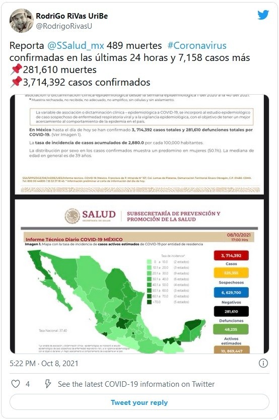 La Secretaría de Salud reportó este sábado 348 nuevas muertes por COVID-19 para un total de 281 mil 958 defunciones, además de otros seis mil 153 nuevos casos para llegar hasta los tres millones 720 mil 545 contagios.Con estas cifras, México se mantiene como el cuarto país con más muertes por COVID-19, detrás de Estados Unidos, Brasil y la India, y el decimoquinto en número de contagios confirmados, según el recuento de la Universidad Johns Hopkins.Las autoridades sanitarias reconocen que, con base en las actas de defunción, la pandemia rondaría los 410 mil fallecidos en el país y estiman que México acumula en realidad tres millones 938 mil 091 contagios.De esta cifra, 47 mil 048 son los casos activos, que han presentado síntomas durante los últimos 14 días y que suponen el 1.2 %. Además, desde el inicio de la pandemia se han recuperado tres millones 076 mil 904 personas.La ocupación media de camas generales es del 28 % y del 26 % para camas de terapia intensiva.Las autoridades también indicaron que el programa de vacunación, que contempla a todos los mayores de 18 años, acumula 106.73 millones de dosis aplicadas al sumar 608 mil 818 durante la última jornada.Hasta ahora, 66.22 millones de personas mayores de 18 años tienen al menos una dosis. De ese total, el 72 % —47.69 millones— ha recibido el esquema completo.JM