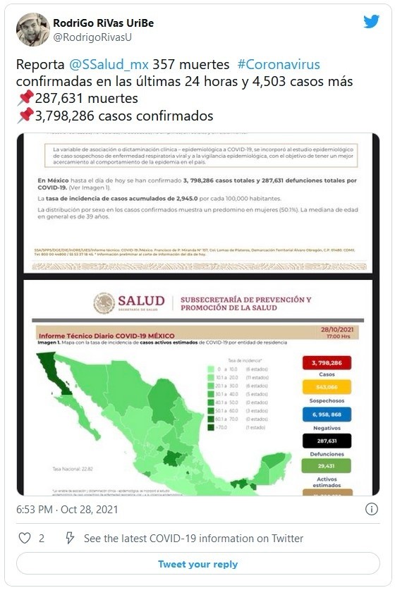 La Secretaría de Salud reportó este jueves 357 nuevas muertes por COVID-19 para un total de 287 mil 631 defunciones, además de otros cuatro mil 503 casos para llegar hasta los tres millones 798 mil 286.Con estos datos, México se mantiene como el cuarto país con más muertes por el virus, detrás de Estados Unidos, Brasil y la India, y el decimoquinto en número de contagios confirmados, según el recuento de la Universidad Johns Hopkins.Las autoridades sanitarias reconocen que, con base en las actas de defunción, la pandemia rondaría los 425 mil fallecidos en el país y estiman que México acumula en realidad cuatro millones 018 mil 472 contagios.De la cifra oficial total, 29 mil 431 son los casos activos, que han presentado síntomas durante los últimos 14 días y suponen el 0.7 %. Además, desde el inicio de la pandemia se han recuperado tres millones 159 mil 461 personas.La ocupación media de camas generales es del 21 % y del 19 % para camas de terapia intensiva.Las autoridades también indicaron que el programa de vacunación, que contempla a todos los mayores de 18 años, acumula más de 118.85 millones de dosis aplicadas, al sumar 793 mil 368 durante la última jornada.Hasta ahora, 71.37 millones de personas mayores de 18 años tienen al menos una dosis. Es decir, el 80 % del total de la población adulta. De ese total, el 78 % (55.94 millones) ha recibido el esquema completo.JM