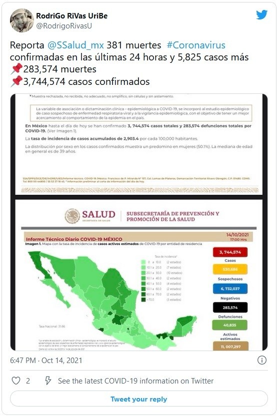La Secretaría de Salud reportó este jueves 381 nuevas muertes por COVID-19 para un total de 283 mil 574 defunciones, además de otros cinco mil 825 nuevos casos para llegar hasta los tres millones 744 mil 574 contagios.Con estas cifras, México se mantiene como el cuarto país con más muertes por COVID-19, detrás de Estados Unidos, Brasil y la India, y el decimoquinto en número de contagios confirmados, según el recuento de la Universidad Johns Hopkins.Calculan que en el país hay 40 mil 835 casos activos, que han presentado síntomas durante los últimos 14 días y que suponen el 1 %. Además, desde el inicio de la pandemia se han recuperado tres millones 103 mil 138 personas.La ocupación media de camas generales es del 26 % y del 24 % para camas de terapia intensiva.Las autoridades también indicaron que el programa de vacunación, que contempla a todos los mayores de 18 años, acumula 109.8 millones de dosis aplicadas al sumar 857 mil 124 durante la última jornada.Hasta ahora, 67.69 millones de personas mayores de 18 años tienen al menos una dosis. Es decir, el 76 % del total de la población adulta. De ese total, el 74 % -50.19 millones- ha recibido el esquema completo.JM