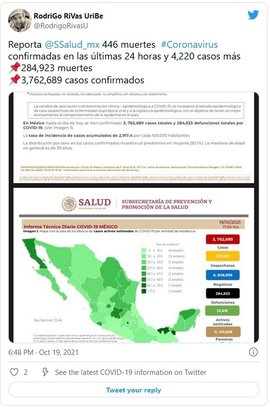 La Secretaría de Salud reportó este martes 446 nuevas muertes por COVID-19 para un total de 284 mil 923 defunciones, además de otros cuatro mil 220 nuevos casos para llegar hasta los tres millones 762 mil 689.Con estas cifras, México se mantiene como el cuarto país con más muertes por el coronavirus, detrás de Estados Unidos, Brasil y la India, y el decimoquinto en número de contagios confirmados, según el recuento de la Universidad Johns Hopkins.Autoridades sanitarias reconocen que, con base en las actas de defunción, la pandemia rondaría los 410 mil fallecidos en el país y estiman que México acumula en realidad tres millones 981 mil 460 contagios.De la cifra oficial total, 32 mil 816 son los casos activos, que han presentado síntomas durante los últimos 14 días y suponen el 0.8 %. Además, desde el inicio de la pandemia se han recuperado tres millones 125 mil 540 personas.La ocupación media de camas generales es del 24 % y del 21 % para camas de terapia intensiva.Las autoridades también indicaron que el programa de vacunación, que contempla a todos los mayores de 18 años, acumula más de 112.6 millones de dosis aplicadas al sumar 404 mil 836 durante la última jornada.Hasta ahora, 69.3 millones de personas mayores de 18 años tienen al menos una dosis. Es decir, el 77 % del total de la población adulta.De ese total, el 74 % (51.52 millones) ha recibido el esquema completo.JM