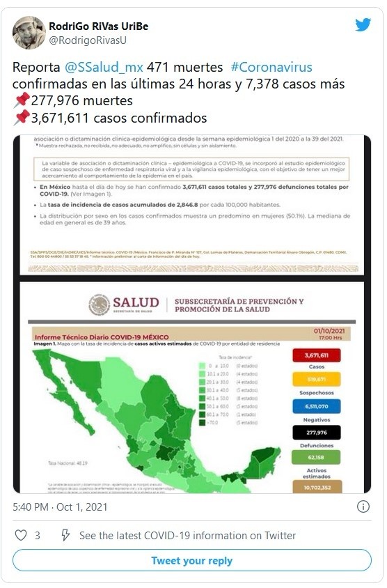 La Secretaría de Salud reportó este viernes 471 nuevas muertes por COVID-19 para un total de 277 mil 976 defunciones, además de otros siete mil 388 nuevos casos para llegar hasta los tres millones 671 mil 611 contagios.Las autoridades sanitarias han reconocido que, con base en las actas de defunción, la pandemia rondaría los 407 mil fallecidos en el país y estiman que México acumula en realidad tres millones 888 mil 196 contagios.De esta cifra, 62 mil 158 son los casos activos, que han presentado síntomas durante los últimos 14 días y que suponen el 1.6 % del total. Además, desde el inicio de la pandemia se han recuperado tres millones 021 mil 124 personas.La ocupación media de camas generales es del 34 % y del 29 % para camas de terapia intensiva.Las autoridades también indicaron que el programa de vacunación, que contempla a todos los mayores de 18 años, acumula 101.78 millones de dosis aplicadas al sumar 591 mil 931 durante la última jornada.Hasta ahora, 64.04 millones de personas mayores de 18 años tiene al menos una dosis. Es decir, el 72 % de la población adulta mayor de 18 años.Si te interesó esta noticia y quieres saber más, entonces descarga y descubre INFORMAPlus, la aplicación digital de EL INFORMADOR, en donde tenemos contenidos exclusivos, seleccionados por nuestros editores, para darles una experiencia más completa a los lectores. Si eres suscriptor de EL INFORMADOR tu acceso está incluido, solicítalo al 33 3678-7777.Descarga la aplicación y pruébala GRATIS por treinta días.Para iOS: https://apple.co/35jaVgbPara Android: https://bit.ly/3gwVSEVJM