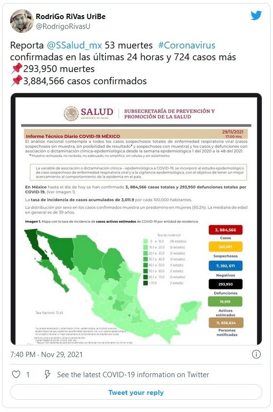 México reportó 53 nuevas muertes por COVID-19 en las últimas 24 horas, para llegar a 293 mil 950 decesos, y 724 nuevos contagios, para un total de tres millones 884 mil 566 casos, informó este lunes la Secretaría de Salud.El país suma más de 17 semanas consecutivas de descenso en los contagios tras una tercera ola que alcanzó su pico entre julio y agosto.De la cifra de casos, hay 19 mil 919 activos, que han presentado síntomas durante los últimos 14 días y suponen el 0.5 % del total. Además, desde el inicio de la pandemia se han recuperado tres millones 242 mil 947 personas.La ocupación media de camas generales se mantiene en 17 % y el uso de camas de terapia intensiva en 13 por ciento.Las autoridades también indicaron que dentro del programa de vacunación, que contempla a todos los mayores de 18 años, se han aplicado más de 132.4 millones de dosis, al sumar 114 mil 108 durante la última jornada.Hasta ahora, 76.7 millones de personas mayores de 18 años tienen al menos una dosis. Es decir, el 85 % del total de la población mayor de edad. De ese total, el 85 % (64.97 millones) ha recibido el esquema completo.JM